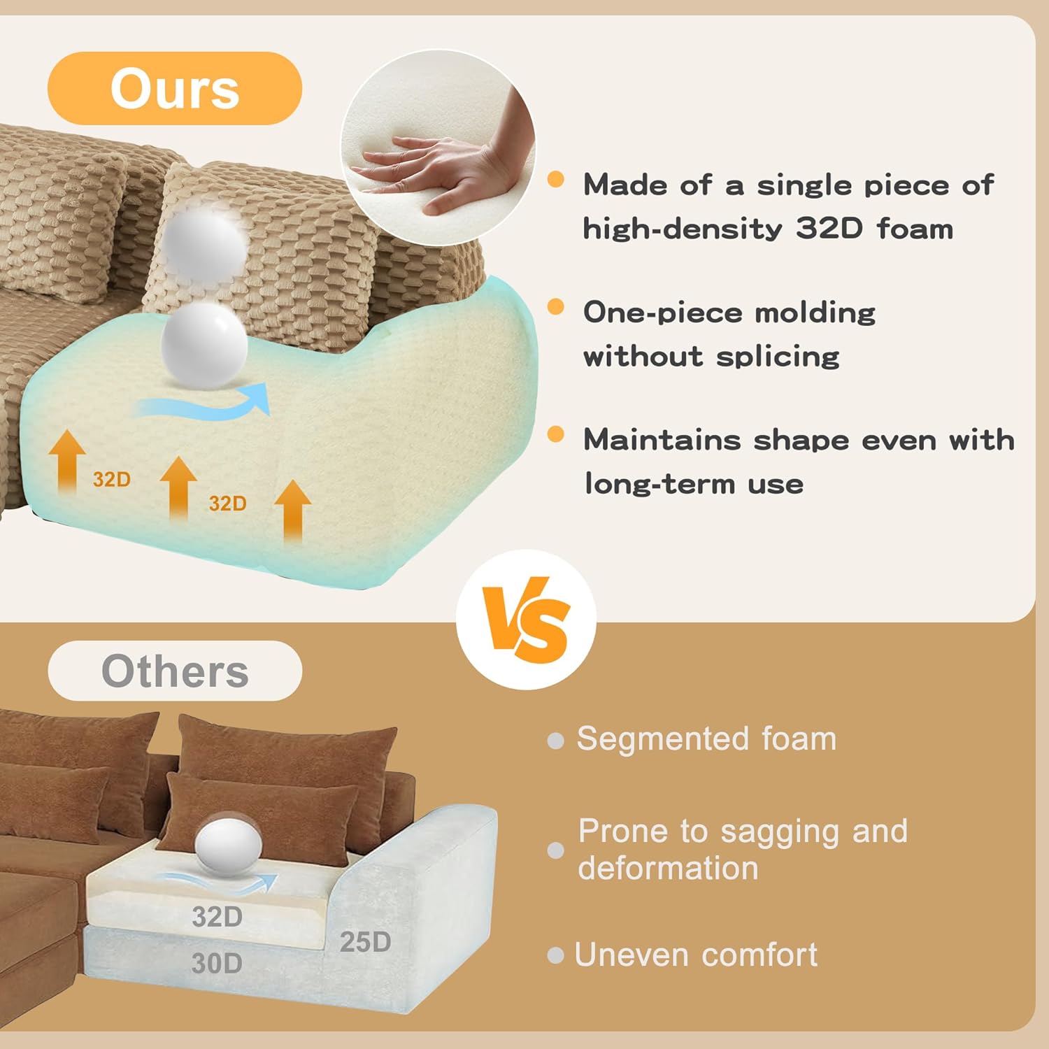 ️ Overall Dimension--- ️ Sofa Size: 146.4"W x 69.3"D x 33.1"H ️ Overall Weight : 183.5 lbs ️ Arm Height - Floor to Arm : 20.4" ️ Seat Depth : 29.1" ️ Arm Width : 11.4" ️ Seat Height- Floor to Seat : 16.5" ️ Backrest Height : 16.9"(Pillow Backrest) ️ ️ Specifications--- ️ ️ Product Name : Sofa ️ Frame Material : 32D Foam ️ Upholstery Material : Flannel ️ Weight Capacity : 300 lbs/seat ️ Removable Pillow Cover : Yes ️ ️ Notes--- ️ 1.Manual measurement has been used,there may be some reasonable error. ️ 2.All the pictures are taken by actual samples,slight chromatic aberration may occur due to lighting or display. ️ ️ Package Dimension--- ️ Package 1 : 9.45 * 9.45 * 31.89 in. 21.78 lbs. ️ Package 2 : 9.45 * 9.45 * 31.89 in. 21.78 lbs. ️ Package 3 : 11.81 * 11.81 * 35.83 in. 36.3 lbs. ️ Package 4 : 11.81 * 11.81 * 35.83 in. 36.3 lbs. ️ Package 5: 16.54 * 16.54 * 44.88 in. 87.89 lbs.