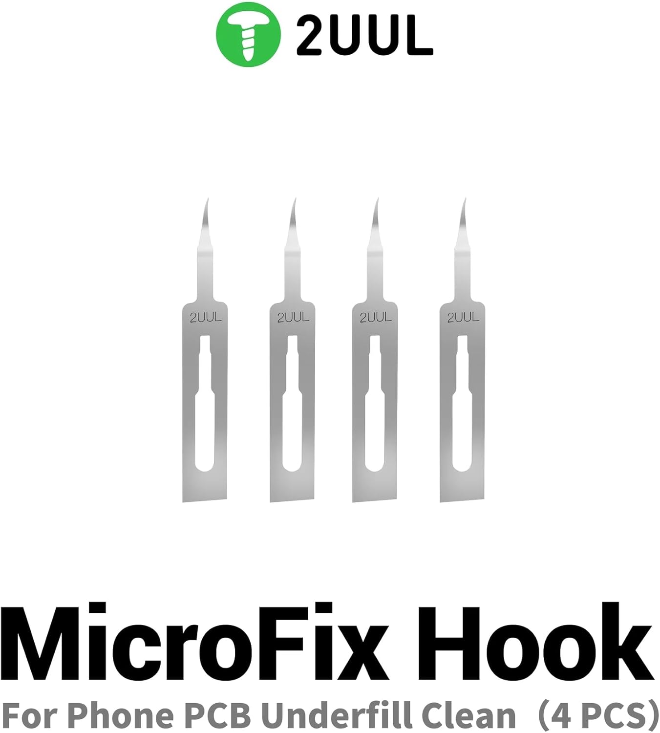 2UUL MicroFix Hook Blades for Phone PCB Underfill Clean Professional Repair Tool 4 Pieces per Set WYLIE Tools 10 Pack➤Product Description:🍀 ✔✿ - The 2UUL MicroFix Hook Blades are precision-engineered tools designed for electronics repair professionals and enthusiasts who demand accuracy in their work;🍀 ✔✿ - These specialized hook-shaped blades excel at phone PCB underfill cleaning and delicate micro-soldering tasks, allowing you to remove stubborn underfill material from circuit boards without damaging sensitive components or traces;🍀 ✔✿ - This comprehensive package includes 10 sets with 4 precision blades per set, providing 40 pieces total for extended professional use. The sharp, fine-point design enables you to work confidently in tight spaces and around critical areas of smartphones, tablets, and other electronic devices;🍀 ✔✿ - Constructed from durable metal material, these blades maintain their sharpness through repeated use, ensuring consistent performance across multiple repair jobs;🍀 ✔✿ - Compatible with WYLIE professional repair tool systems, these MicroFix hooks integrate seamlessly into your existing toolkit. Whether you're running a repair shop or tackling DIY electronics projects, these precision instruments deliver the control and reliability needed for component-level repairs and intricate PCB work.📦➤Package Contents:✿- 1x Pack of 2UUL MicroFix Hook Blades for Phone PCB Underfill Clean Professional Repair Tool 4 Pieces per Set;✿- 1x PCS of WYLIE name card PVC fine frosted plastic material removing screen functional card;✿- 1x PCS of WYLIE WL-5A Solder paste scraper dismantling machine piece non destructive tin scraping slice;✿- 1x Pair of WYLIE ESD BGA repaire soldering working antiskid new environmental protection carbon fiber gloves;✿- 1x Pack of WYLIE 5PCS High temperature resistance thermal pads screen insulation sheet for iPhone 11-17 Pro Max Plus;✿- 1x PCS of WYLIE WL-002 Superfine silver jump wire 0.02MM copper wire ultra fine fly line for iPhone fingerprint mainboard chip repair;✿- 3x PCS of WYLIE WL-9A Dismantling Blade for iPhone iPad Domestically Produced Curved Mobile Phone LCD Screen Dismantling Tool;✿- 1x PCS of WYLIE K1 blade durable screen opener with 5 different depth corners tear down and flake opening pry tool for iPhone for Android Huawei Oppo iPad Macbook screen tool.