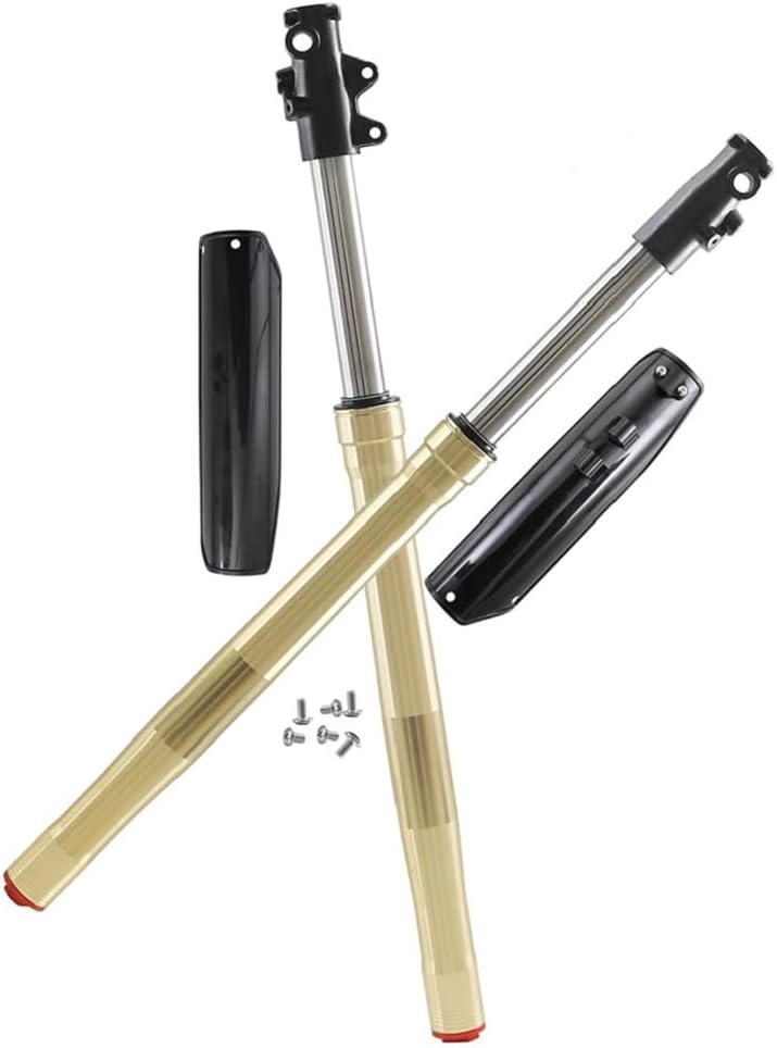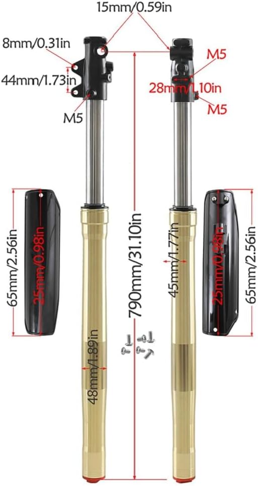 Name: Front Forks Shock Condition: brand new Color: gold Material: metal Position: front Type: upside down Total length: 790mm/ 31.1 inchLength (from leg top to wheel axle centre) Upper Leg Diameter -- 45mm/ 1.77 inch Lower Leg Diameter -- 48mm/ 1.89 inch Axle hole: 15mm/ 0.59 inch Fitment: universal for 17inch 19inch 21inch pit bike dirt bike offroad motorcycle Package Includes: A Pair 790mm Front Fork A Set of Triple Tree Clamp