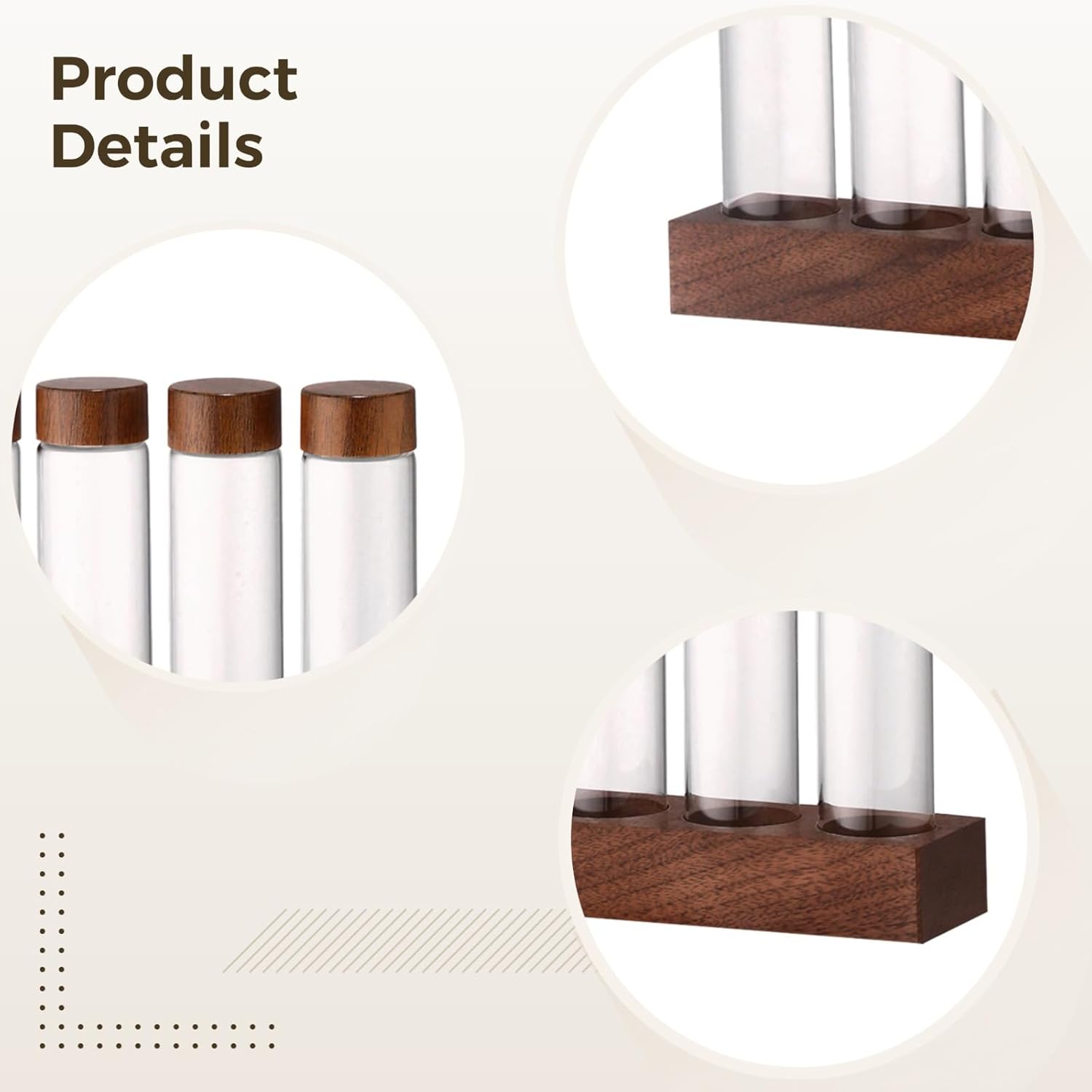 Color: Brown Material: Wood,Glass Size: Base: 9.1 x 1.7 x 0.9 in / 23 x 4.4 x 2.3 cm Package Includes: 1 x Six-Hole Walnut Base,1 x Six Glass Tubes Note: - Please refer to the measurement. Tiny measuring error is allowable in normal range. - There might be a little color difference due to the monitor, camera or other factors, please refer to the physical item.