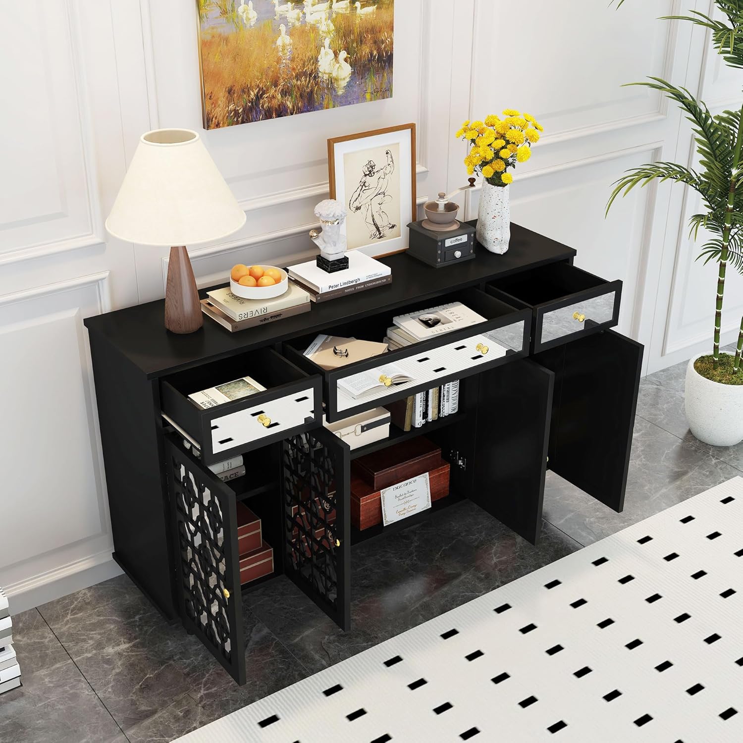 Accent Buffet Sideboard with 4 Mirror Doors, Storage Cabinet Console Table with Adjustable Shelves, Kitchen Cupboard Server Bar Cabinet for Living Room Hallway Black