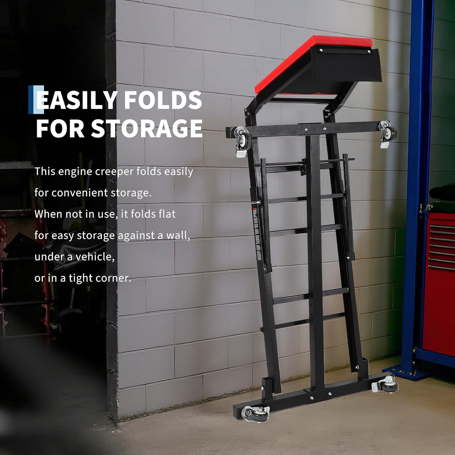 The Topside Heavy-Duty Engine High Top Creeper – the solution for professional mechanics and DIY enthusiasts seeking precision, durability, and ergonomic comfort in automotive and industrial maintenance. Features:1.Adjustable creeper height to fit your desired placement for your vehicle3.Padded deck allows for added comfort while working on your truck or car3.Top Creeper easily folds away for a compact configuration when not in use4.Four swivel casters make moving the Top Creeper into position smooth and easy5.Two locking casters to lock in your position prior to climb up and using the Top Creeper; locking weight capacity: 400 poundsSpecations:1.Five Height Adjustable 45"-66"2.3 Tilt Adjustable3.Included:2×Casters W/O Brake 2×Rigid Brake4.High Strength Bots&Lock Nuts5.Anti-slip Desgin6.Max Weight Capactity:400LBs(180kg)Upgrade your automotive repair experience with our Topside Automotive Engine Creeper. Its combination of heavy-duty performance, adjustable height, enhanced comfort, and portable design makes it the solution for all your repair and maintenance needs. Whether you're working on a compact car or a heavy-duty truck, this creeper is built to help you work smarter, faster, and more comfortably.
