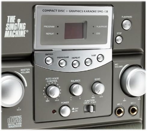 Be the star as you sing along with this fun and entertaining Karaoke Singing Machine. Top-loading machine plays CDs and CD+graphics disks. Microphone on side looks like those professionals use. Other features include auto voice control, master volume control, balance music/vocal control, 2 microphone inputs, 2-digit LED CDG track indicator and AC power operation. Imported.