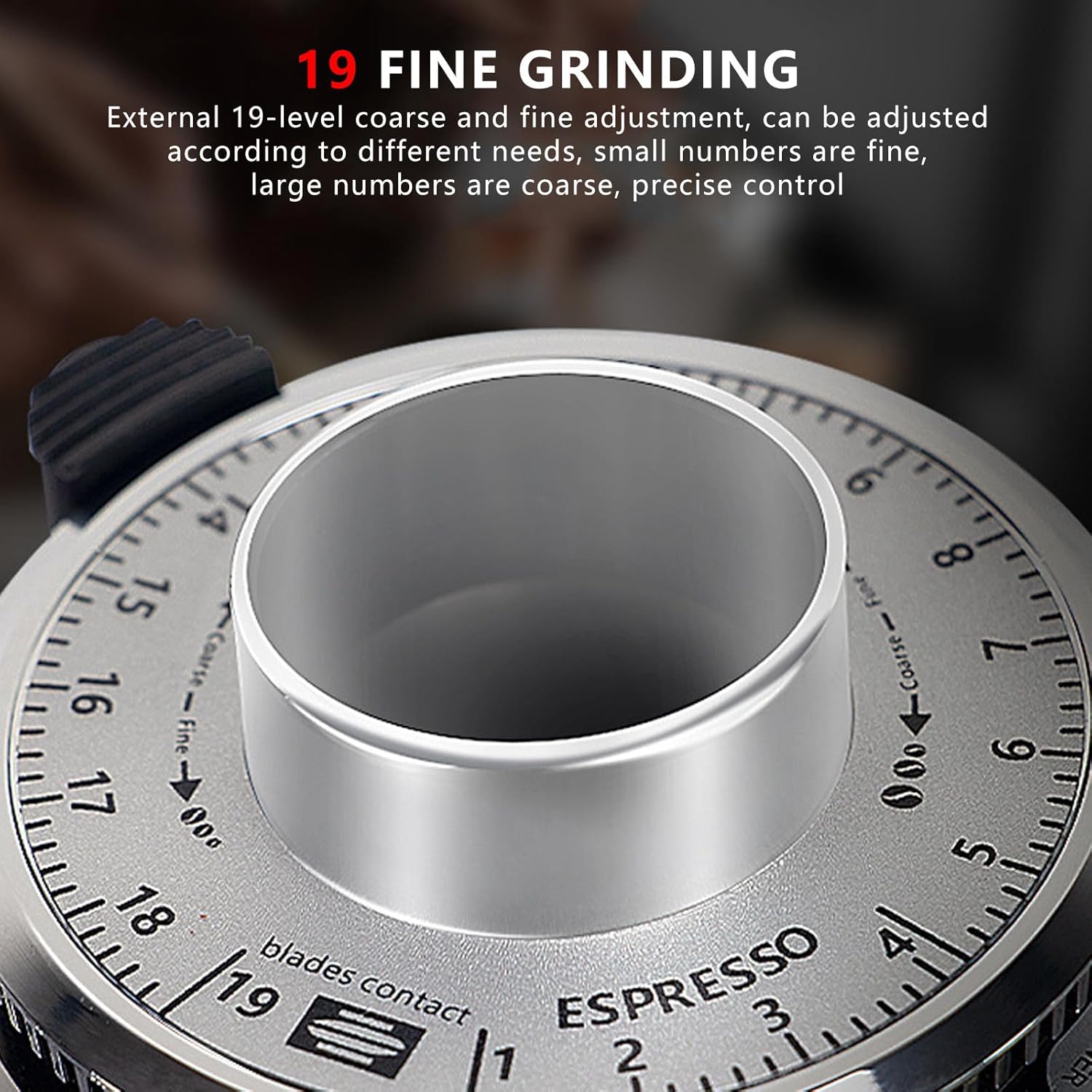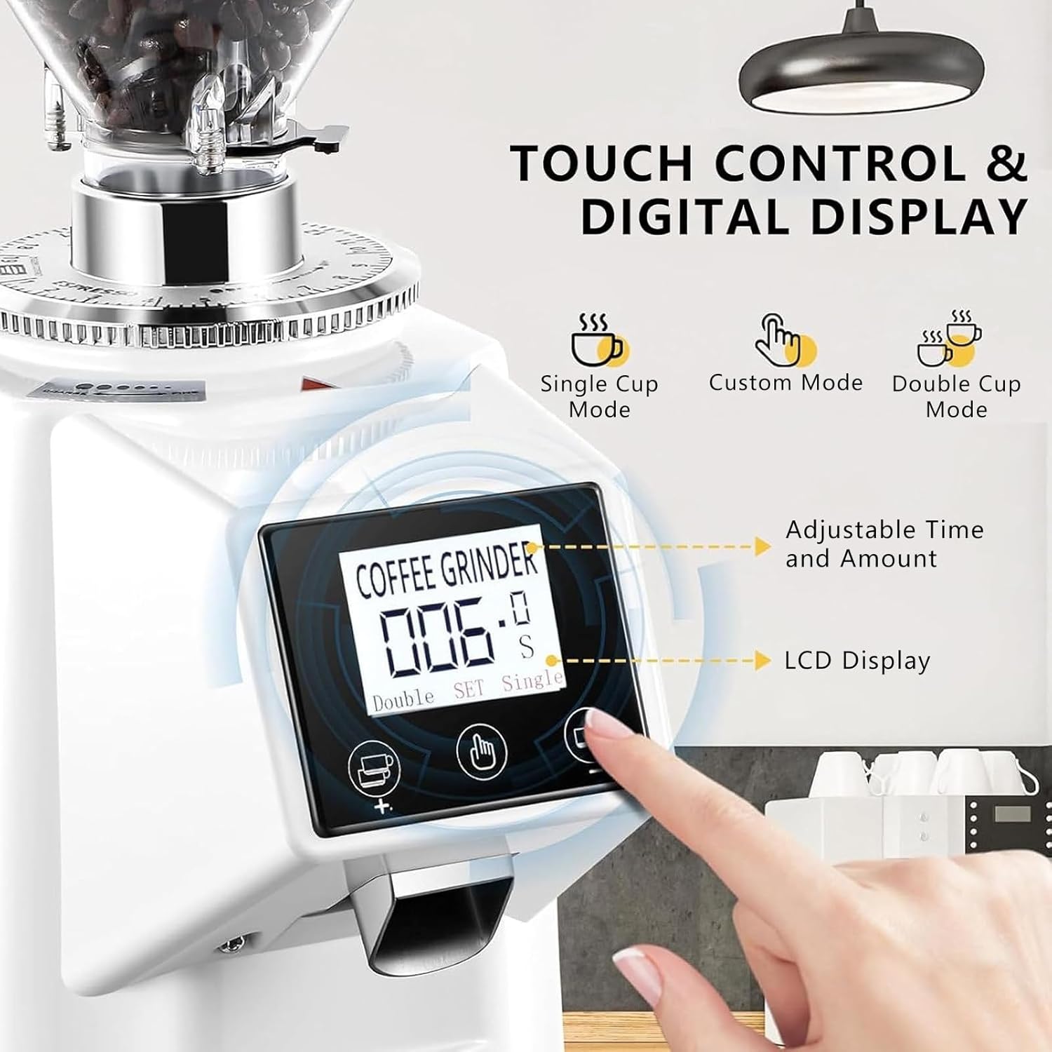 Crafted for accuracy and durability, this grinder features 19 adjustable grind levels and an intuitive LCD touch screen with timed dosing for precise single or double portions. The 60 mm stainless steel flat burrs ensuring consistent grinding with minimal heat buildup, preserving the full aroma and flavor of your beans. Built from robust aluminum alloy, it includes a removable 1500 ml bean hopper (holding about 500g of beans) and manipulate quietly, making it for home or commercial use【FEATURE】●Large Capacity Freshness Hopper: Coffee grinder equipped with a large 1500ml(500g) removable hopper and a coffee bean stopper, and it allows for the bulk grinding of coffee beans in one go. The bean stopper enables simple control of bean flow, protecting the beans from moisture and keeps coffee beans fresh for 4 weeks●LCD Touch Control Panel: Navigate settings effortlessly with a sleek interface, offering single/double cup modes and 19 grind levels for complete customization●60 mm Stainless Steel Flat Burr Grinding Disc: Designed for durability and uniform grounds, minimizing heat to protect the essence of oily or flavored beans●Removable Components: Simple-to-clean bean bin and detachable parts ensuring hygiene and low-maintenance daily use【SPECIFICATION】Product name: Automatic Coffee GrinderBody materials: Aluminum AlloyColor: Black/WhitePower: 200 WVoltage: 110 VBean capacity: 1500ml (500g)Grinding disc diameter: 60 mmGrinding degree: 19 Levels of Coarse and Fine GrindingSize: 46x23x13 cmWeight: 5 kg【PACKAGE LIST】Compact Coffee Grinder x1Power Cord x1Brush x1Instruction Manual x1