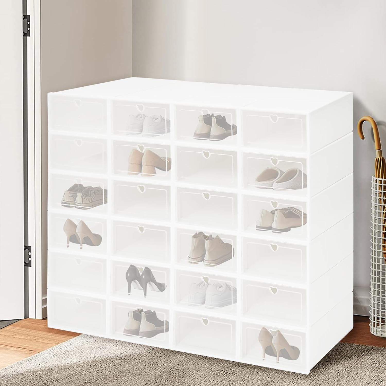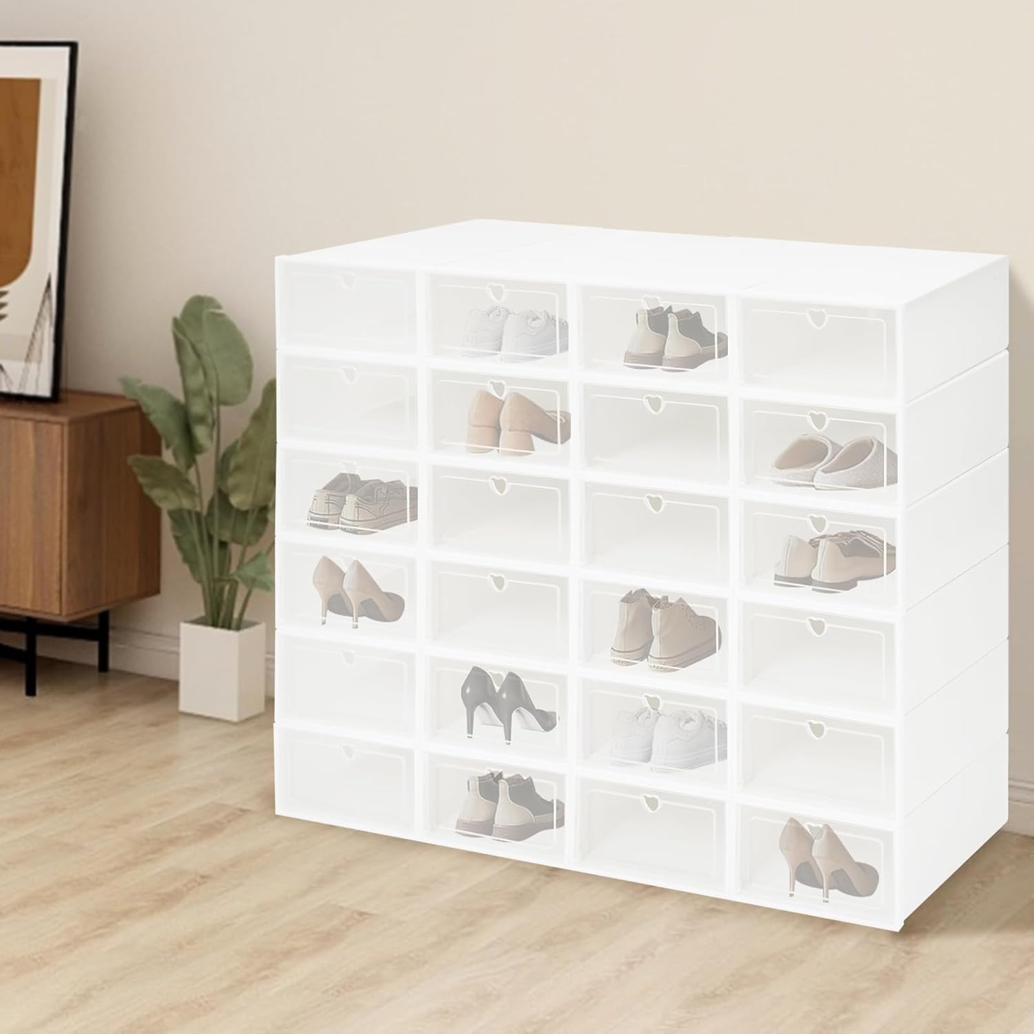 ApplicationIt can hold various types of shoes, including sneakers, high heels, canvas shoes, boots, etc. It is also a good choice to be used as a storage box to put such items as cosmetics, medicines, books, and toys. It can be placed under the bed, in the cabinet, closet, bedroom, living room, balcony, entrance hall, and any corner of your home.How to Install1.Open the package and take out the parts of the shoe box then start assembling.2.Folding the shoe boxes.3.Bend the bottom of the box and peel off excess parts then snap the buckle into the hole.4.Snapping the buckle into the hole.5.Fold the tabs into the box.6.Take out the box door and snap the door into the shoe boxes.7.The installation is complete!How to Splice1. Installing two boxes, please insert the boxes into the buckle.2. When the same layer of the shoe box is connected, fix the box frame edge and lock the boxes.3. The combination is completed.4. Follow the above steps to connect to a shoe cabinet.SpecificationMount Type: FreestandingAssembly Required: YesNumber of Boxes: 24Material: PPProcess: Injection MoldingColor: White, ClearShape: RectangularStyle: ModernSingle Shoebox Size: 33*23*14cm/13*9.05*5.5inPackage Size: 47.8*36.6*13cm/18.82*14.41*5.12inGross Weight: 5.3kg/11.68lbsNet Weight: 4.9kg/10.8lbsPackage Included24* Shoe Boxes1* English Manual