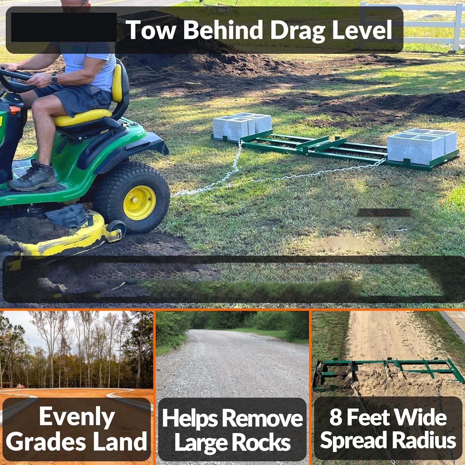 The Original 4FT Drag Harrow Driveway Grader - 45.2 LB Heavy Duty Tow Behind Lawn & Landscape RakeTransform your lawn, driveway, and landscape maintenance with The Original 4FT Drag Harrow Driveway Grader, a heavy-duty tow-behind tool designed to level, grade, and groom any outdoor surface with ease. This 45.2-pound metal drag harrow features a 4-foot length, 20-inch width, and 4.7-inch height, making it perfect for leveling gravel, soil, sand, and grass—ideal for maintaining driveways, gardens, pastures, and more. Crafted from heavy-duty steel with a sleek green finish, this power rake, lawn leveler, and gravel driveway drag combines durability with versatility, easily attaching to ATVs, UTVs, lawn tractors, and trucks to handle all your landscaping and property maintenance needs.FAQs 1) Q: What are the dimensions of this 4FT drag harrow driveway grader?A: The assembled dimensions are 48.00 inches (4FT) in length, 20.00 inches in width, and 4.70 inches in height, with a total product weight of 45.20 pounds.2) Q: What material is this drag harrow made of, and is it durable?A: It is crafted from heavy-duty steel, designed for exceptional durability and reliable performance on rugged, uneven surfaces—perfect for year-round use and long-lasting value.3) Q: Can I adjust the weight of this driveway grader?A: Yes, it features adjustable weight control: you can easily add stones or blocks to the frame to increase weight, and the adjustable width fits different block sizes, letting you adapt the force to your terrain and grading needs.4) Q: What vehicles can this drag harrow attach to?A: It is compatible with a wide range of vehicles, including ATVs, UTVs, trucks, and lawn tractors. It attaches quickly to your vehicle’s hitch via a heavy-duty 4-foot chain.5) Q: What applications is this drag harrow suitable for?A: It is versatile for leveling gravel, soil, sand, and grass—ideal for maintaining driveways, gardens, pastures, and more. It also works as a lawn leveler, power rake, field drag, and gravel rake.6) Q: Is this a heavy-duty tool, and can it handle compacted surfaces?A: Yes, it is a 45.2 LB heavy-duty drag harrow; adding extra weight (stones/blocks) enhances its effectiveness on compacted surfaces, making it perfect for tough grading tasks.7) Q: Does this drag harrow work as a lawn leveler and gravel driveway drag?A: Yes, it doubles as a lawn leveler, power rake, gravel driveway drag, and field drag—handling all your yard leveling, lawn aeration, and gravel driveway maintenance needs.8) Q: Is assembly required for this tow-behind landscape rake?A: Minimal assembly is required, and the package includes all necessary components and clear instructions to get you up and running quickly—no complex tools or expertise needed.Packing Information:The package includes The Original 4FT Drag Harrow Driveway Grader, heavy-duty 4-foot attachment chain, all necessary hardware, and detailed step-by-step assembly instructions. Please note: Manual measurements may have slight reasonable errors, and the green color may vary slightly due to lighting or screen display. To maximize the tool’s lifespan, clean it after use to prevent rust and store it in a dry area when not in use. If any parts are damaged, missing, or defective upon arrival, please contact our customer support team immediately for prompt assistance.
