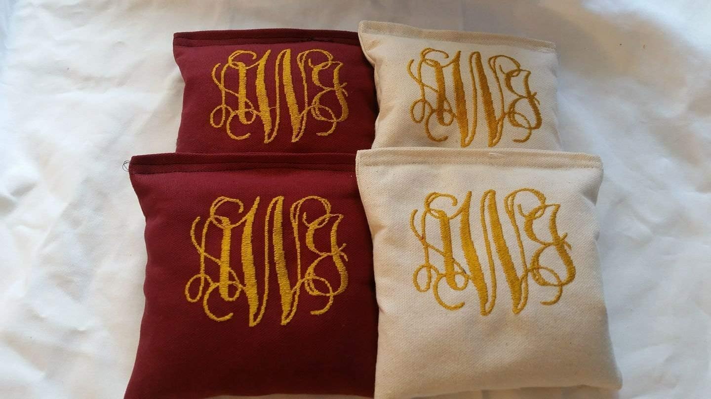 These are regulation corn hole bags. You receive 4 of one color and 4 of another. They are 6x6, duck canvas, filled with 14-16 ounces of corn or all weather filling and double stitched with outdoor thread. Embroidery can be up to 4 lines in any shown font (scroll through photos for font list). I can do images and logos please message me (you can attach a .jpeg) through messaging system when checking out.