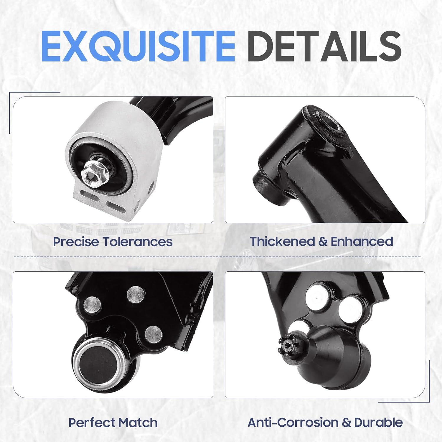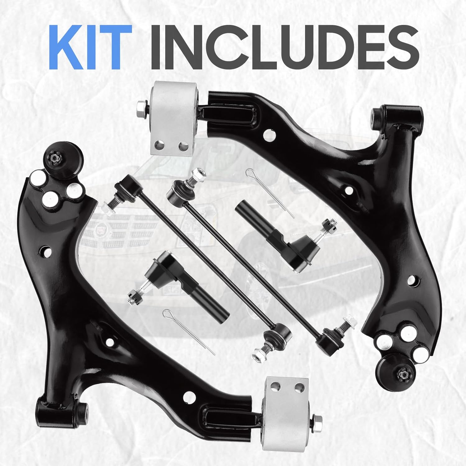 | Included Components | 1x Front Left Lower Control Arm + Ball Joint, 1x Front Left Sway Bar End Link, 1x Front Right Lower Control Arm + Ball Joint, 1x Front Right Sway Bar End Link, 2x Front Outer Tie Rod Ends |