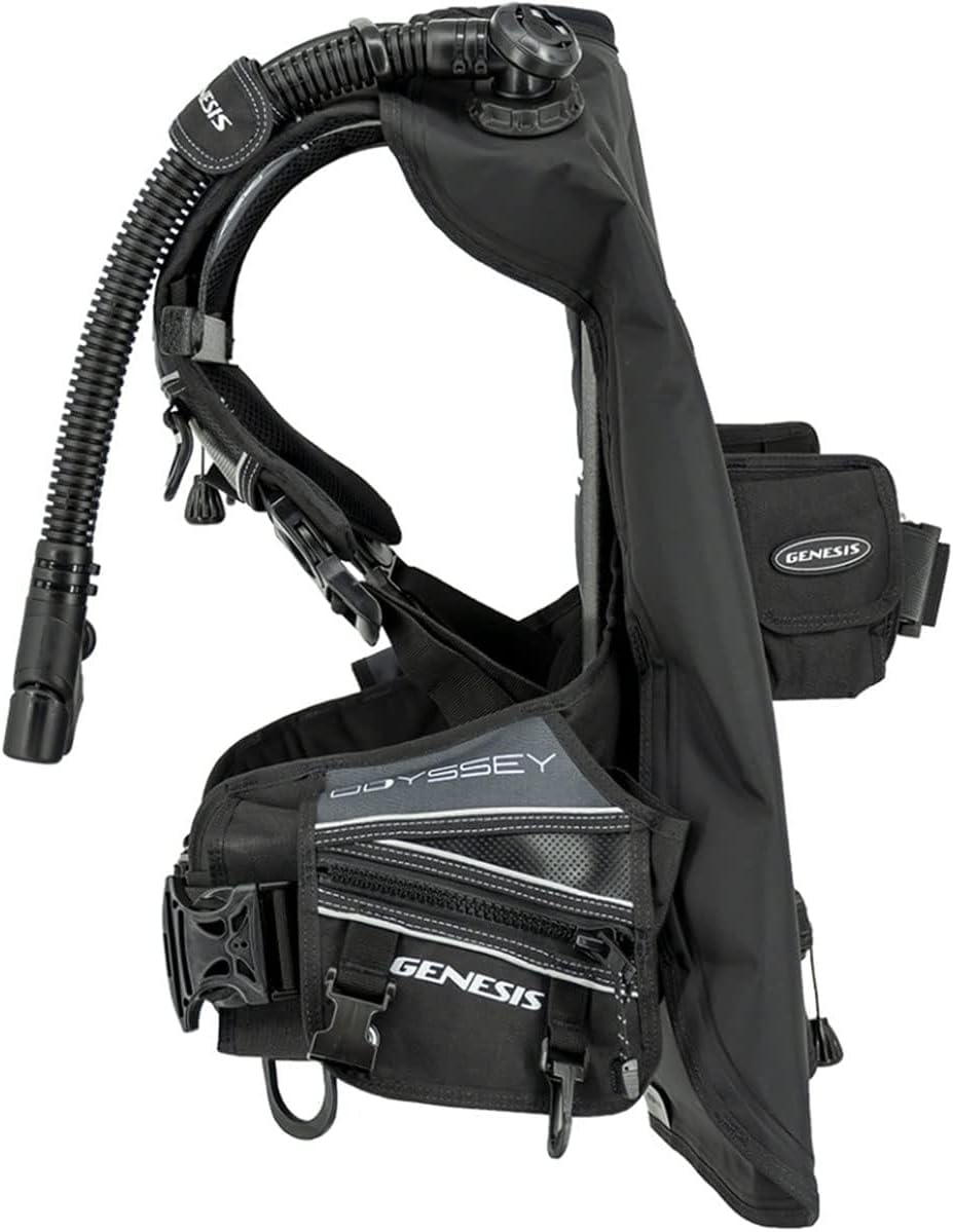 The Genesis Odyssey BCD is the perfect complement to the Award-Winning Genesis Origin. This is a back inflation model with similar weight system, features, and functionality to the Origin (see SKU: GNSO). Lightweight and ergonomic, the Genesis Odyssey has all the functions and features you are looking for in a back inflation BCD. The easy to access quick release ditchable weight pockets hold up to 10 lbs. (4.54kg) of weight each along with two 5 lbs. (2.27kg) trim weight pockets. The back inflation air-cell is low-profile, easily expands and contracts with the assistance of an air-cell bungee cord. In addition, this BC is Pro-Kit fit ready (see SKU's: GNSBPKL, GNSBPKM) and has two expandable zipper pockets. Built-to-Last: 600D polyester with PVC backing and a 420D nylon urethane laminated radio frequency (RF) welded air-cell for years of reliable use. Buoyancy control is made easy with the Genesis power inflator mechanism with cable activated pull dump at the left shoulder and a pull dump valve on right shoulder. The BCD is also equipped with a lower rear right pull dump/overpressure relief valve with manual pull for trimming of buoyancy when you are inverted in the water. The Genesis power inflator comes with a 3/8" threaded quick-disconnect low-pressure hose. Making the proper fit is easy with the BCD harness assembly consists of swivel buckle torso adjustable shoulder straps with an adjustable sternum strap and adjustable waist strap with cummerbund.