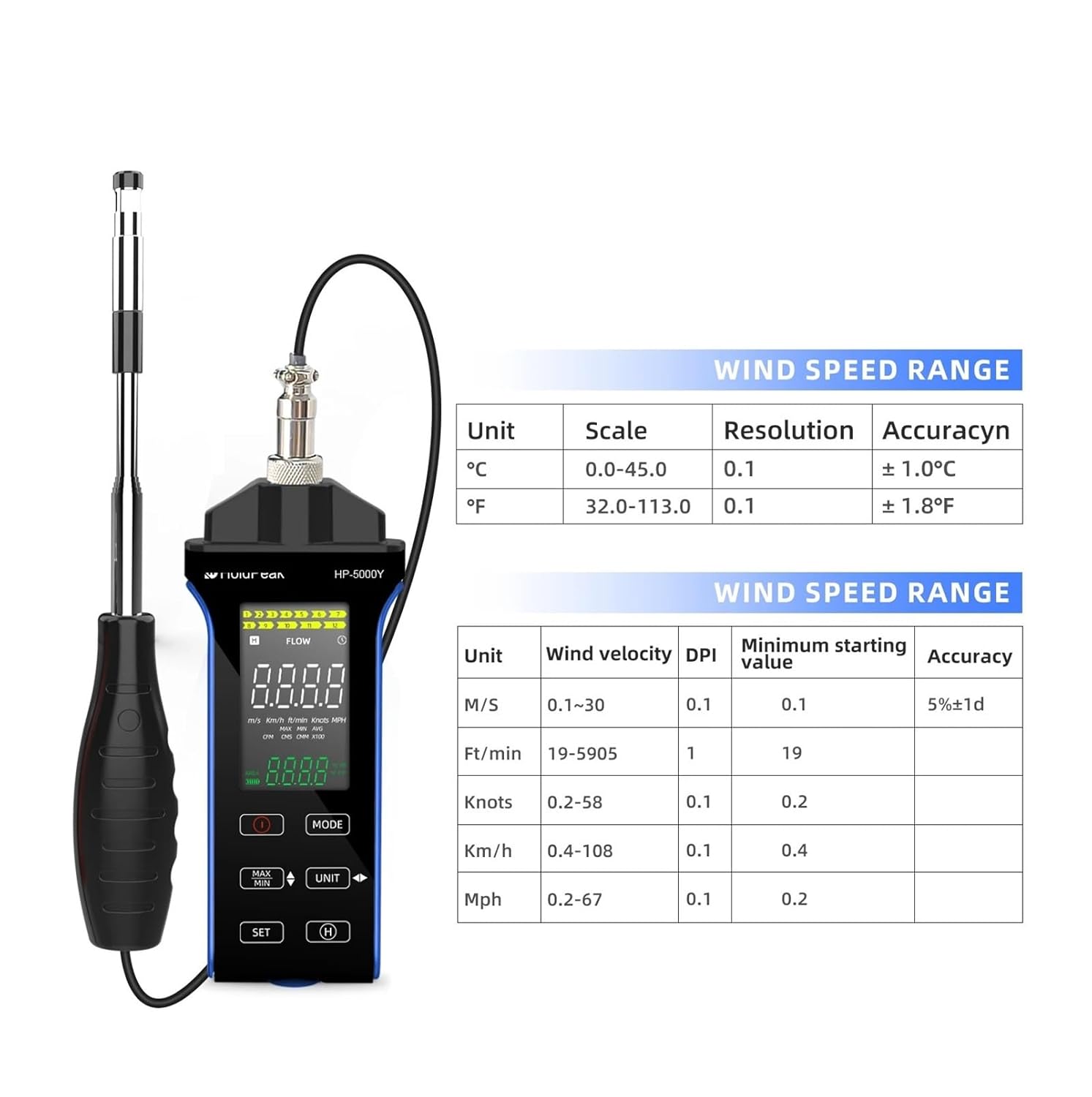 Specifications:Type : AnemometerModel Number : 5000YWind Speed Range1 : M/s 0.1-30Wind Speed Range2 : Ft/min 19-5905Wind Speed Range3 : Knots 0.2-58Wind Speed Range4 : Km/h 0.4-108