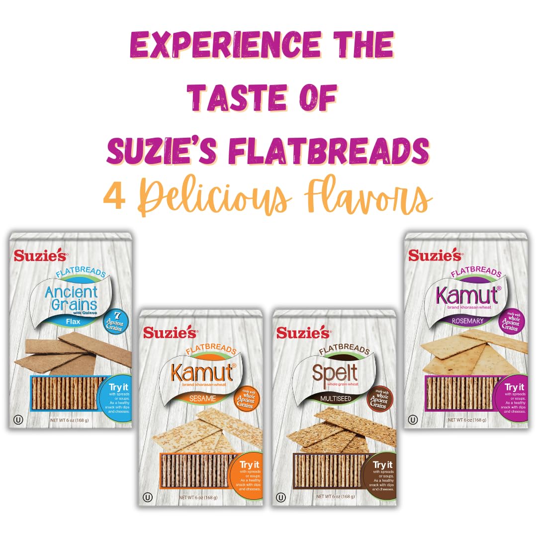 • FOR ANY OCCASION: From the pantry to your party, our Kamut flatbreads are the perfect pairing for soups, salads, salsas, and spreads, or topped with meat or cheese. Enjoy Suzie’s low-carb crackers sweet or savory or just as good on their own!