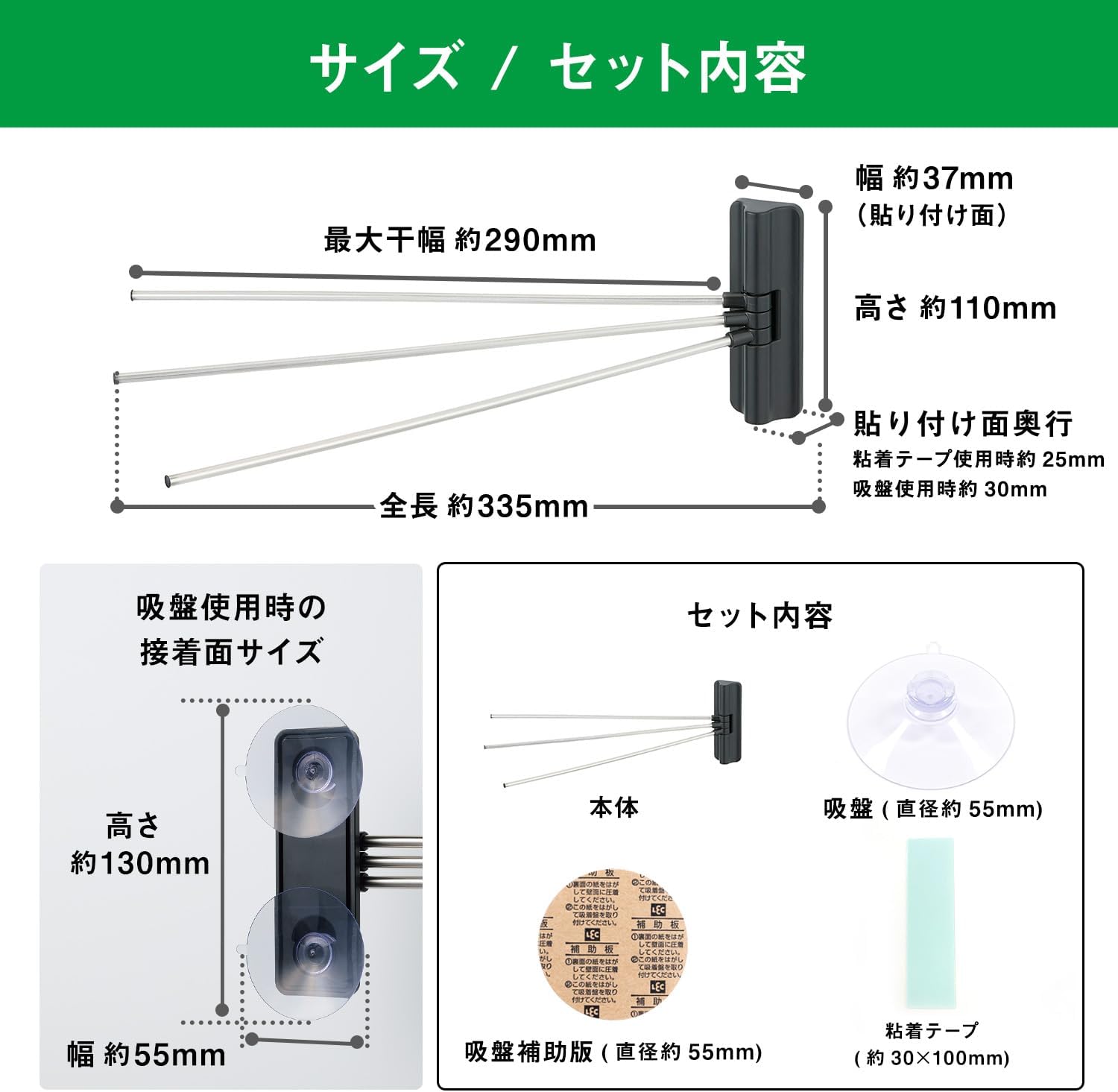 You can choose between two mounting methods of suction cups and adhesive tape. Load capacity: 10.6 oz (300 g) (3.5 oz (100 g) per arm). The movable arm can hold 3 dishcloths. Rust resistant stainless steel pipe.