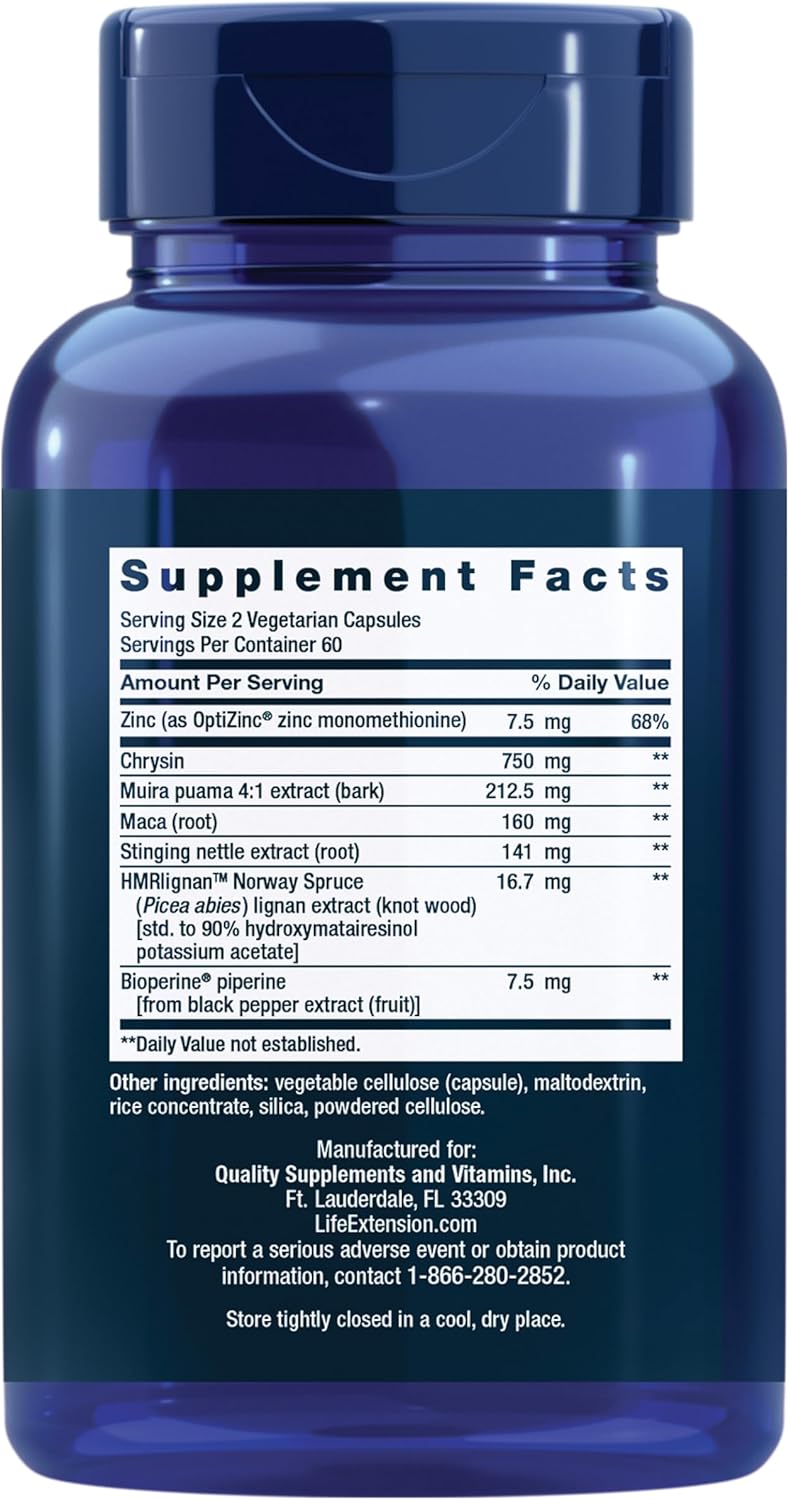 | Special Ingredients | Chrysin, Maca (root), Muira puama 4:1 extract (bark), Stinging and dwarf nettle extracts (root), Zinc (as zinc monomethionine) |