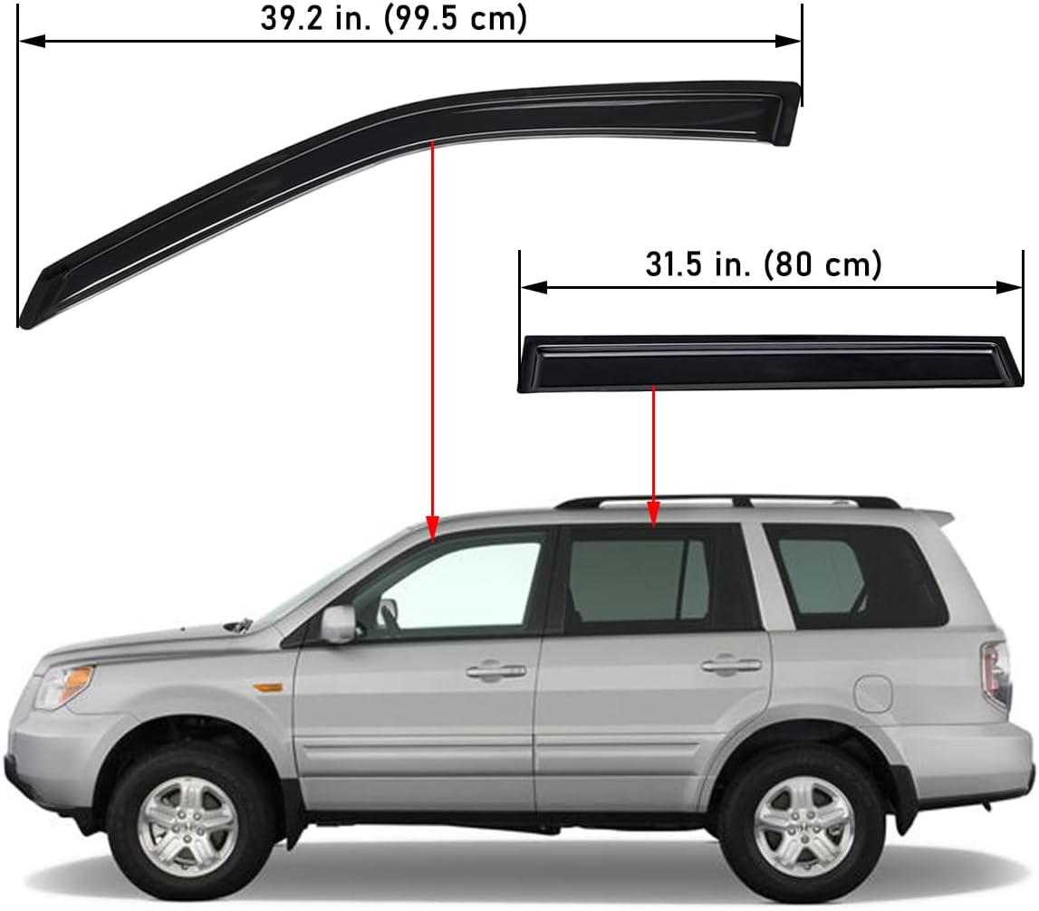 Vehicles Fitments:Fits 2003-2008 Honda PilotIncludes:2 Pieces of Front Window Deflectors 2 Pieces of Rear Window Deflectors Installation Instructions Mounting AccessoriesThe window visors are designed for the car owners who love the naturally fresh air with A/C offand windows cracked open in the sunny days. They also help those cars with inefficient A/C to keep fresh air circulation, free of stale air and windshield/window fogging in the raining or anyweather condition. This side window deflectors help to reduce the temperature of the car's cab,when parked in the sunshine with windows partly open. Rain guards are not bodyguard, but theyblock UV ray, wind, moisture, insects and other debris from entering the car cab, to protect driverand passengers. They help to reduce sun exposure and glare while driving.As a world-wide popular stuff, the side window deflectors have become the most favorite caraccessory for the many car owners. We are proud to be a professional manufacturer as we carry awide variety of window visors that are made with global high-impact materials, precisemeasurements for an accurate fit, looks and functionality all-in-one. Our complete product rangecontain In-Channel, Tape-on, Dark Smoke and Matte Black for buyer's options.Don't hesitate to inform us your vehicle's year, make, model or engine number, and our expertscan find a set of rain guards that will fit the windows of your beloved cars.Let our set of window deflectors make your trips and ride more enjoyable.