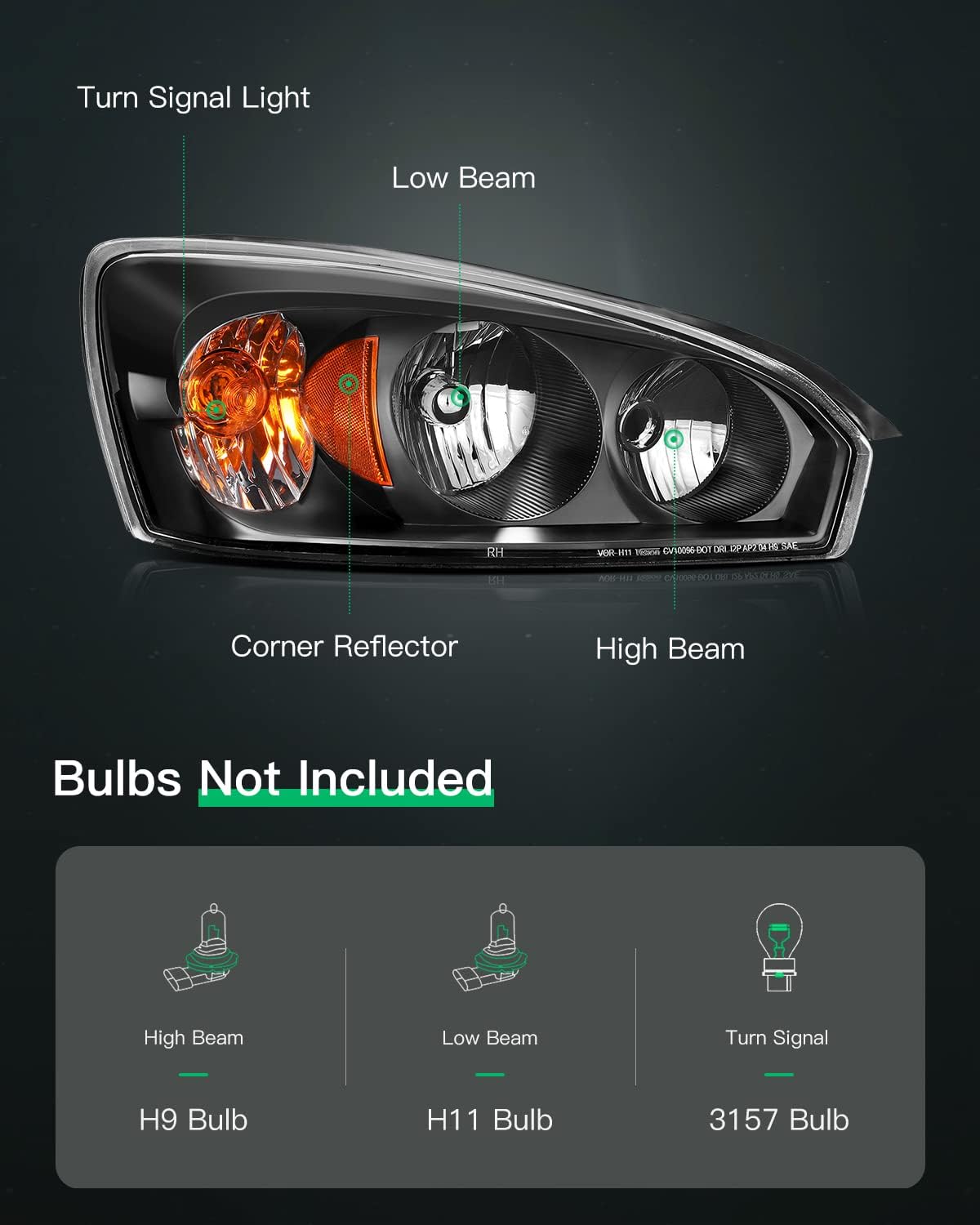 | Light Source | High Beam:H9 / Low Beam:H11 / Turn Signal:3157 |