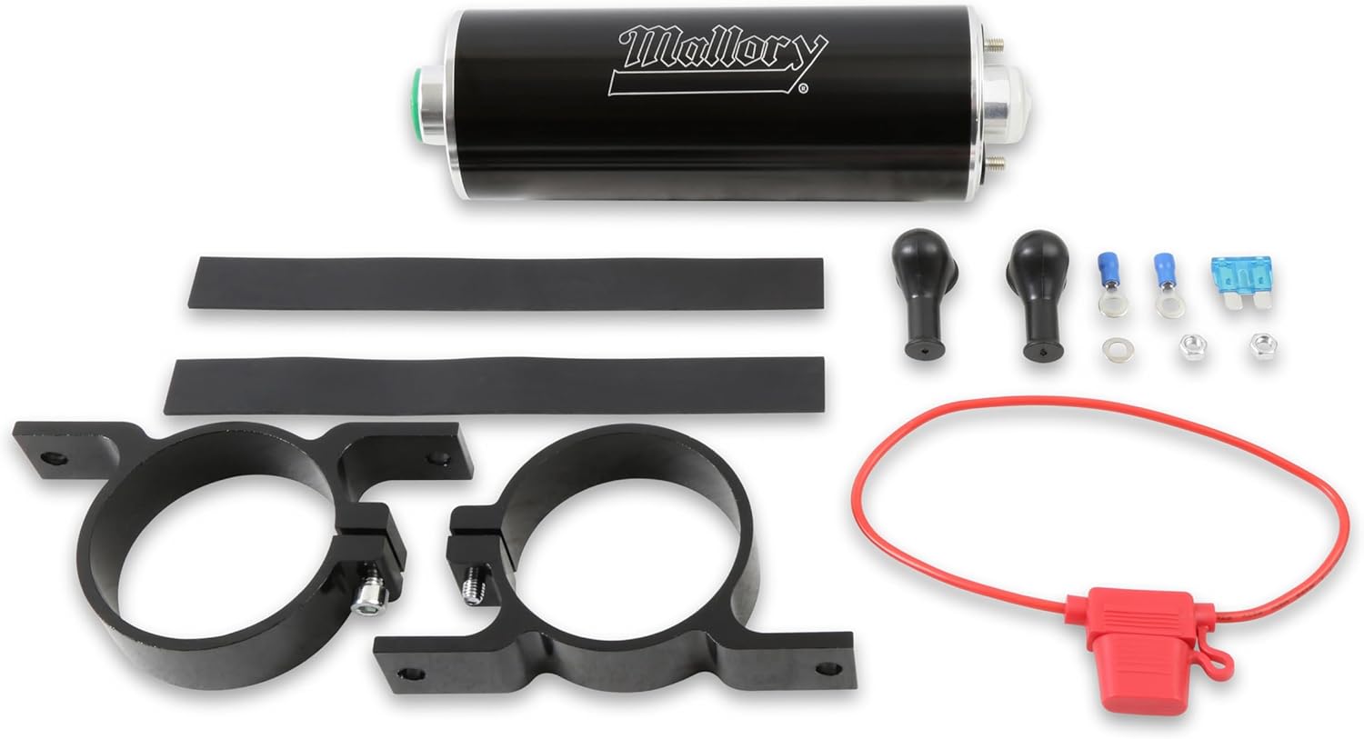 Mallory's new fuel pump for high pressure fuel injection is now available in an in-line configuration. It is compact in design so it's great when space is tight. This is a high pressure high volume 12-volt pump. This muscular pump delivers 110+GPH free flow at 14 volts. At 40psi and 14 volts it pumps 83+GPH and 73+GPH at 65psi and 14 volts. Use Mallory regulator 4305M for best performance. It's also best to use Mallory's pre-filter 3175 to protect the pump.