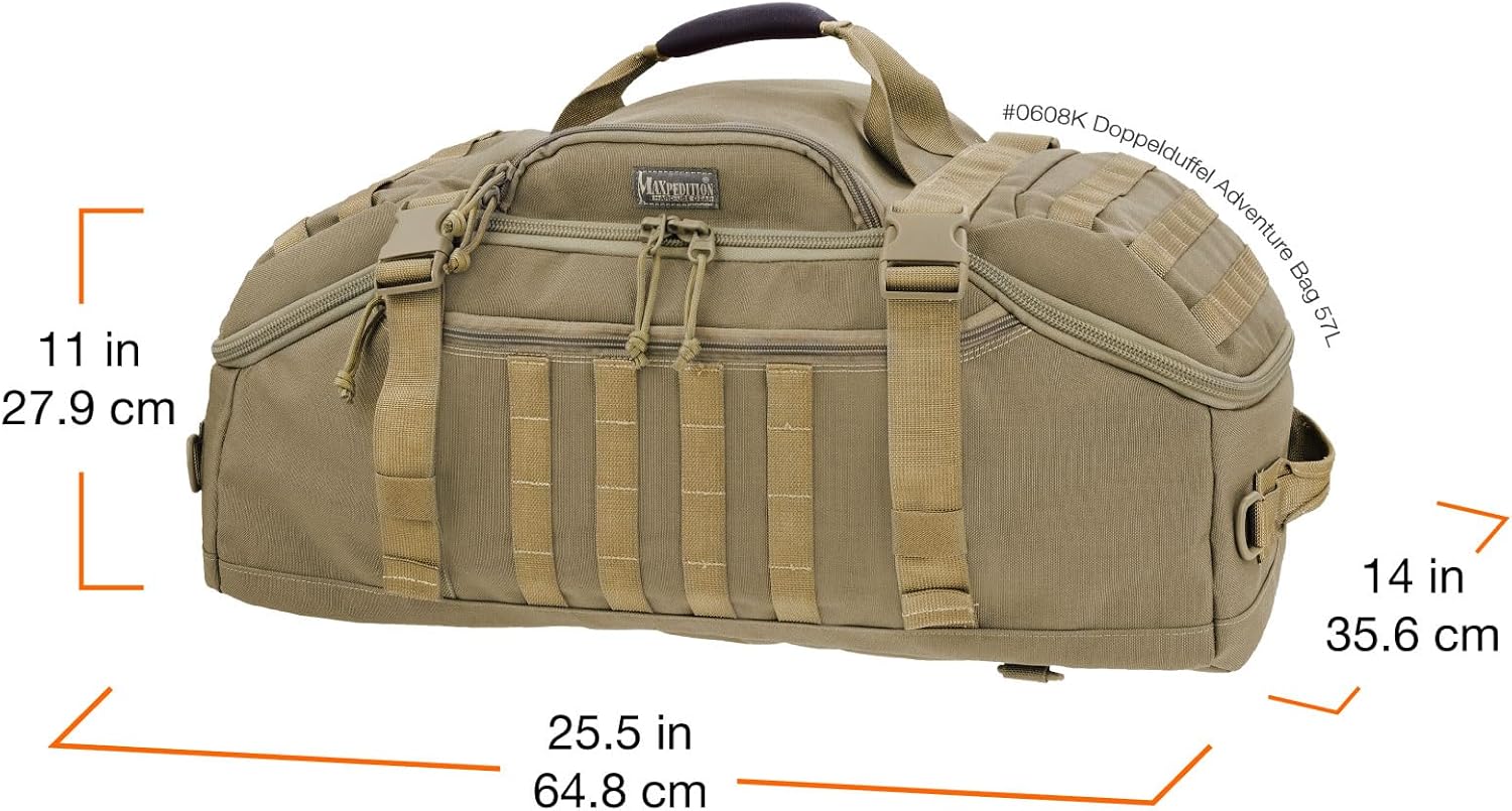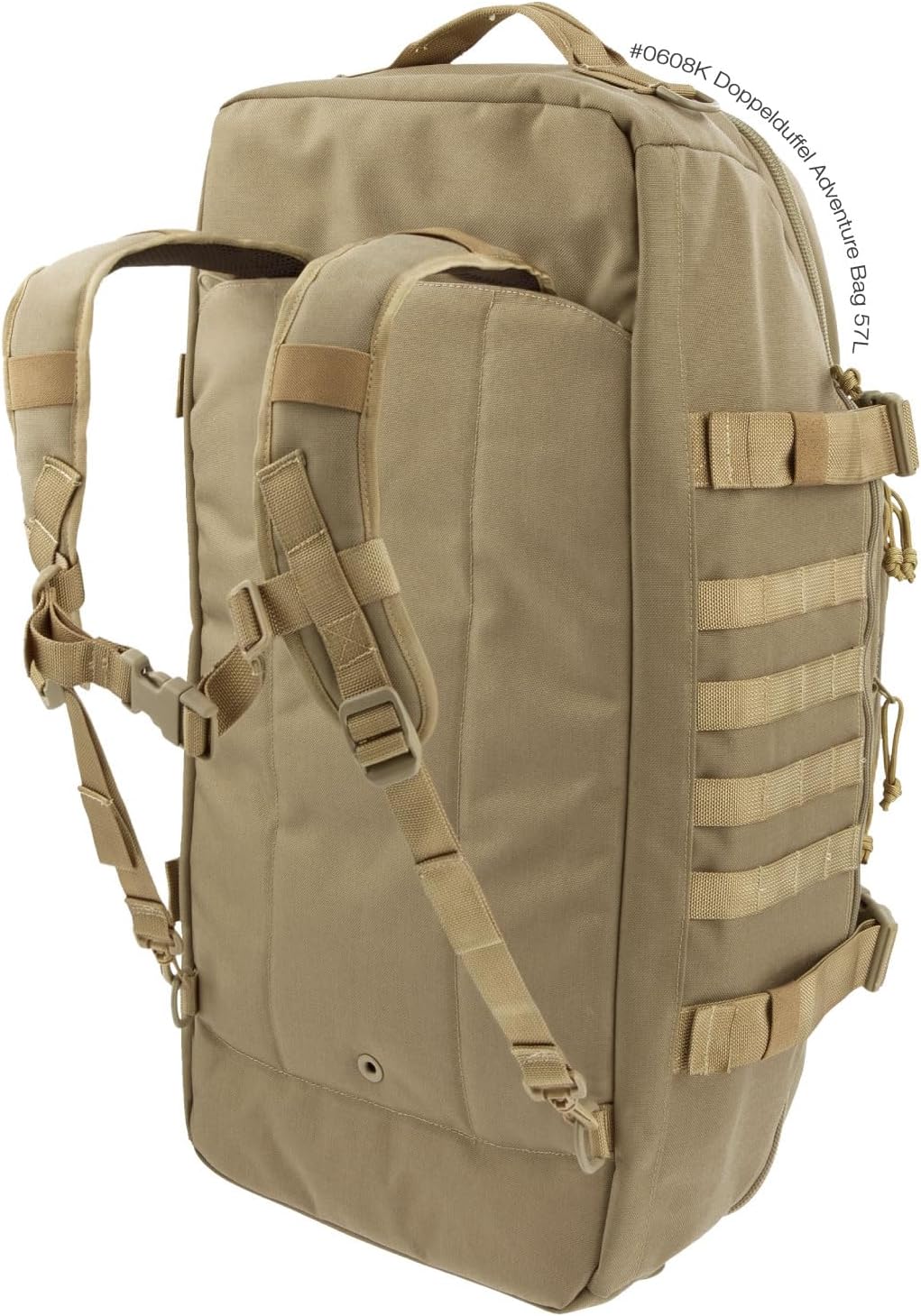 The DOPPELDUFFEL Adventure Bag is a unique large travel bag that may be carried by hand, shoulder strap in 2 orientations, or with hide-away integral backpack straps. Two (2) internal padded divider can split main compartment into smaller sections.
