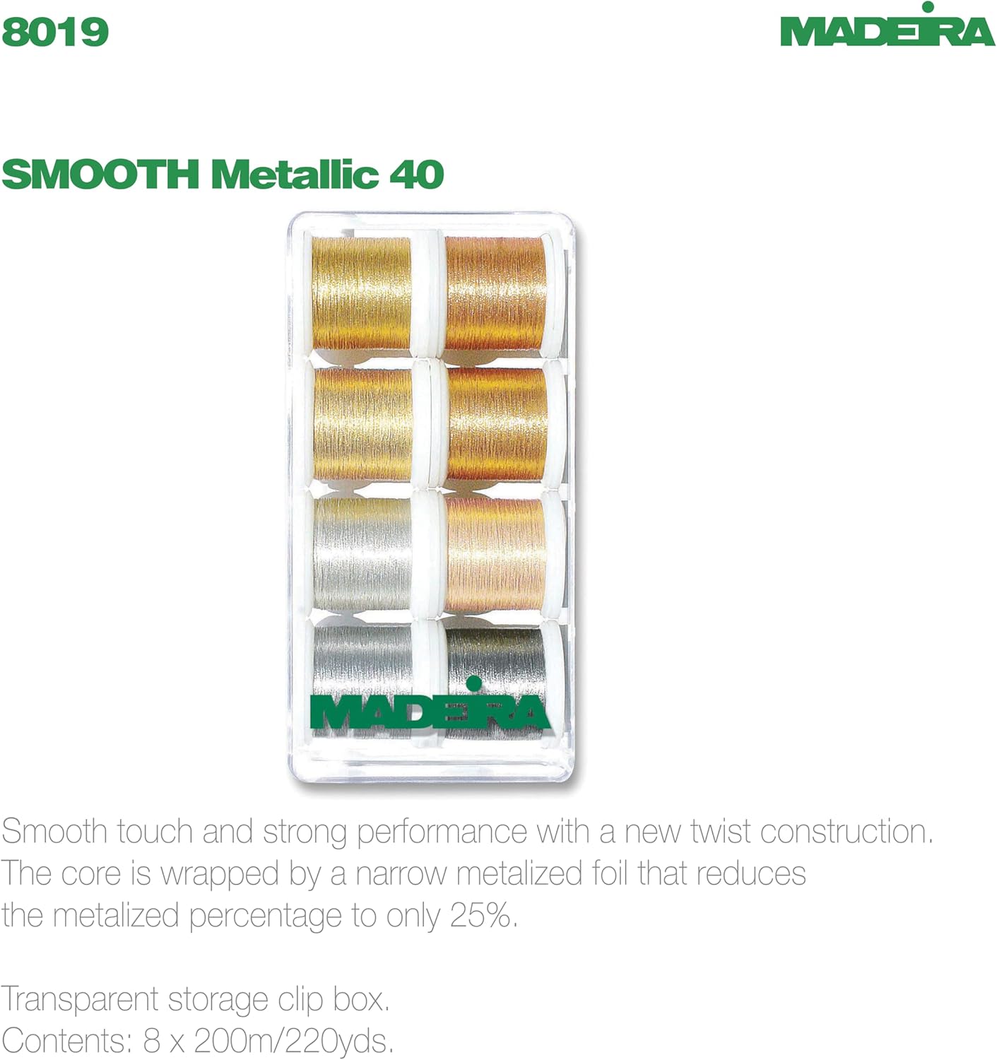 Smooth touch and strong performance thanks to a new twist construction. The core is wrapped by a narrow metalized foil that reduces the metalized percentage to only 25%. Includes 8 spools of Polyneon No. 40 200m/ 220 yds. Made from 100% Polyester.