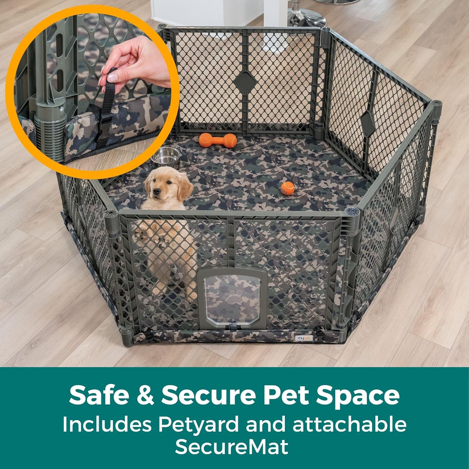 Looking for dog enclosure ideas? Whether you're setting up a play area indoors or outside, the Petyard Protect Bundle from North States is the ultimate all-in-one solution! You get a premium quality petyard and the one-of-a-kind SecureMat featuring a unique attachment system that easily fastens to the Petyard to give your pet a safer, more comfortable space and protect your home too. The petyard sets up in seconds with exclusive dual Self-locking SuperHinges that instantly click securely into place for fast, frustration-free setup. No twisting knobs or tools required! The SecureMat attaches directly to the petyard using 12 quick-release buckles, preventing your pet from shifting it around and keeping your them comfortable and contained. The petyard also includes a 9.5” x 8” pet door that swings freely, allowing your pet the freedom to come and go as they please. Want to contain your pet? No problem, the small door also locks for containment offering you peace of mind. This pet enclosure is over 5 feet across and 26" tall—its large size is perfect for small to medium pets with plenty of room to play and grow. The SuperGrip feet and skid-resistant pads keep the yard stable on carpets or hard floors, all while protecting your surfaces from scratches. The included SecureMat™ is made with triple-layer quilted construction to provide soft, supportive cushioning for your pet. When it gets messy, just toss it in the washing machine for easy cleanup. It can be used as a puppy enclosure indoors or outdoors! Both the puppy pen and mat fold compactly and include carry straps, making this bundle ideal for travel, outdoor hangouts, or everyday use at home. Dark hunter green petyard and SecureMat with fun camo print design featuring dark hunter green, khaki & brown tones for your outdoor lover.