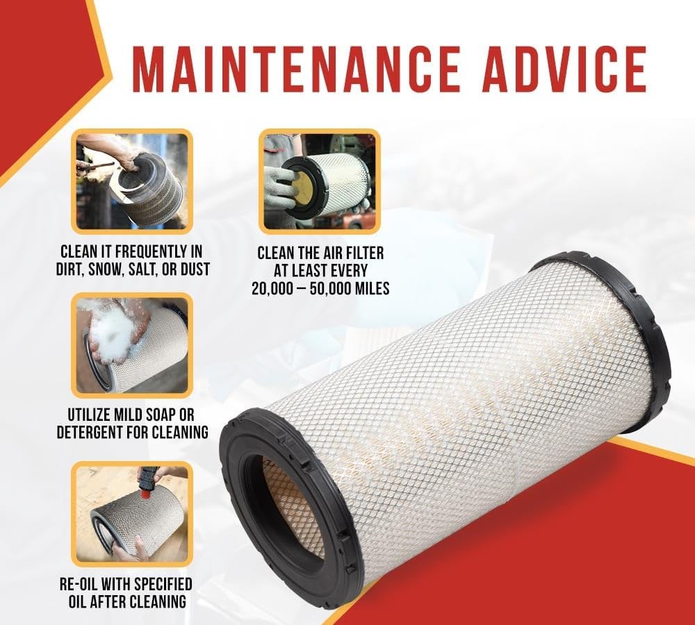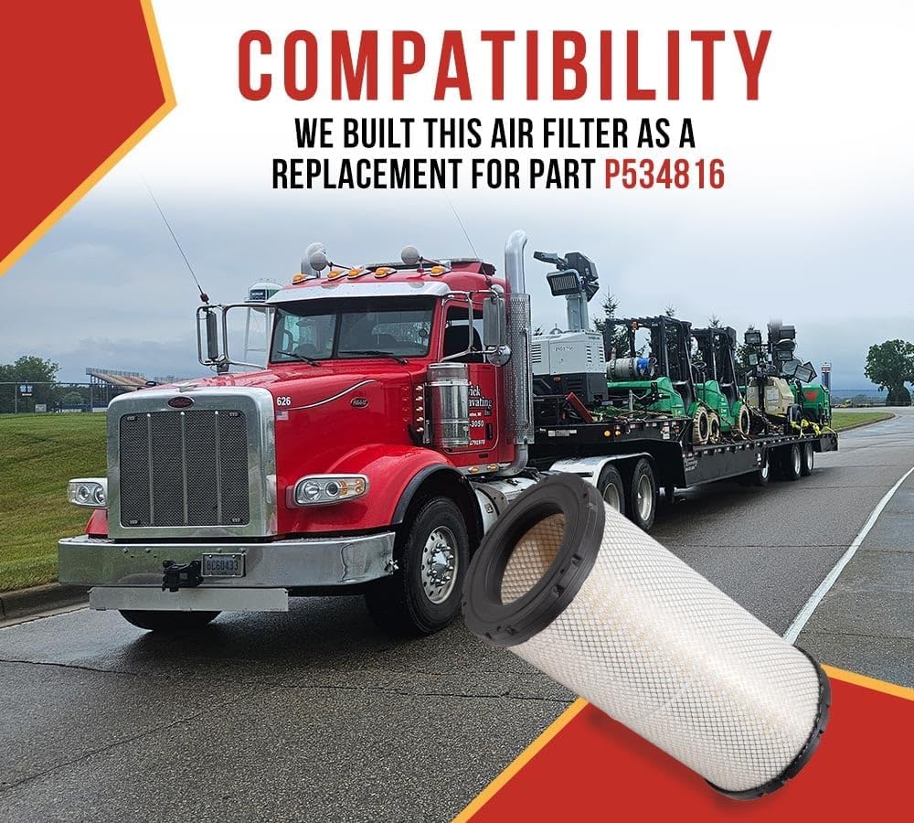 Restrict the entry of dust, dirt, and other large particles into the engine with our Engine Air Filter for Trucks Replaces P534816 OEM. We have constructed this filter with highly durable and premium material, which is great at withstanding engine harsh conditions, changing temperatures, and vibration. The filter is installed inside the engine's front side of the semi-truck for clean airflow. It’s designed with exact dimension details. Check out the complete details below:-Dimension Details: Our air filter has an outer diameter of 11 inches, an inner diameter of 6-3/4 inches, and a height of 23-1/2". The dimensions are approximately similar to the OEM part number. You have to install these air filters on the front side of the air intake engine compartment.Robust Construction: Considering the space in which it will be installed, we have designed this semi-truck air filter from durable and high-quality materials. It has to withstand the harsh engine conditions, changing temperatures, vibrations, and more. The filter is specially designed to act as a barrier between the engine and dust, dirt, and other contaminants, keeping the efficiency fluent.Uninterrupted Vehicle Efficiency: Our air intake filter will perform similarly to the original manufactured product. It will ensure clear airflow, enhancing horsepower and fuel mileage. In short, it will reduce the strain on the engine and improve fuel economy.Direct Fit Replacement: We have constructed this air filter with an exact part number P534816.Regular Inspection: Follow for long-lasting performance:- Clean the air filter at least every 20,000 to 50,000 miles for normal highway usage.Clean it frequently in dirty, snowy, salty, or dusty conditions.Utilize mild soap or detergent for cleaning.Re-oil with specified oil after cleaningNote: Check the compatibility brands, models, and replacement numbers before purchasing.
