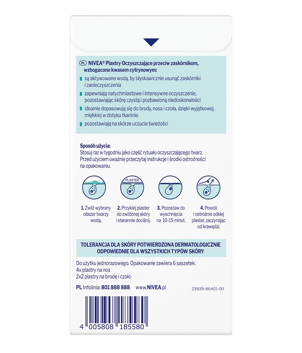The T-Zone areas (nose, chin and forehead) are most prone to becoming blocked with dirt, oil, make-up and blackheads. These strips help keep the pores unclogged so that the skin looks refined and fresh. HOW IT WORKS NIVEA VISAGE Refining Clear-Up Strips thoroughly remove blackheads and intensively cleanse the pores: The strips enriched with Citric Acid are coated with a special ingredient that bond with the dirt and impurities clogging the pores when activated by water The special soft touch fleece is very soft to your skin and the clear-up strip bonds well on the uneven facial areas, especially nose Pores are unclogged and the skin looks clear