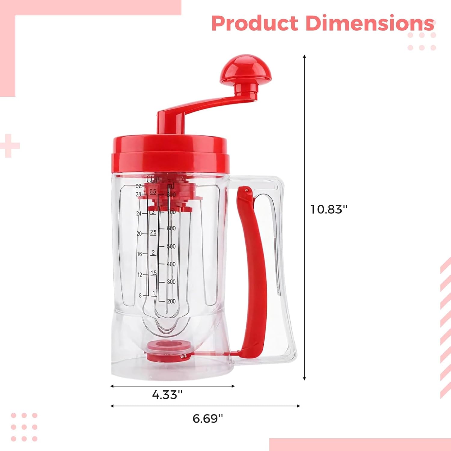 Color:Transparent, Red Material:ABS Product Size: 11.4 x 4.3 inches / 29.0 x 10.9 cm Package Includes:1 * Batter Dispenser Note: - Please refer to the measurement. Tiny measuring error is allowable in normal range. - There might be a little color difference due to the monitor, camera or other factors, please refer to the physical item.