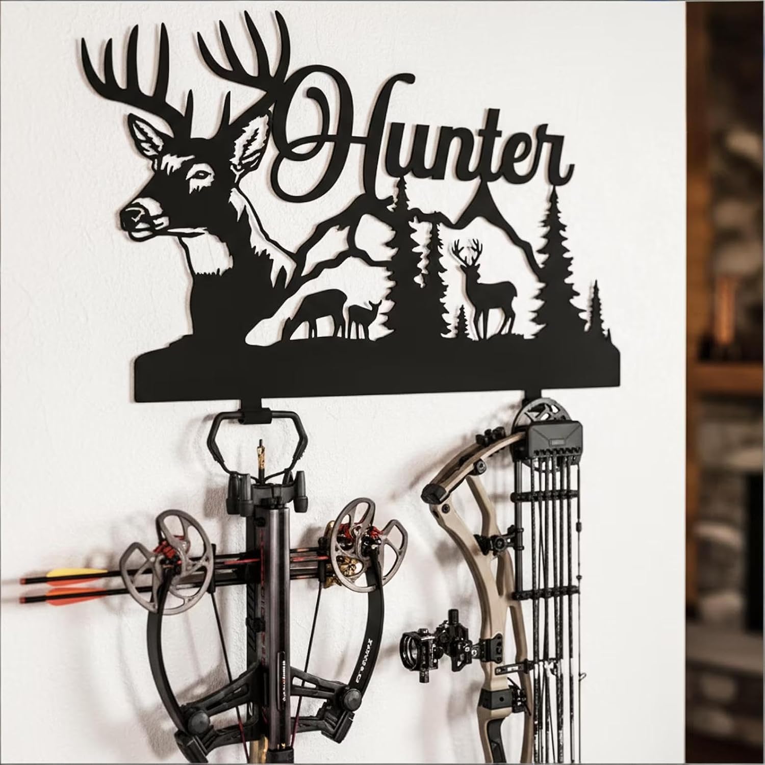 Bring rugged outdoor style into any space with this Personalized Metal Bow Holder, designed for bowhunters who want functional storage with a custom touch. Featuring a bold deer skull and antler silhouette, this metal wall art combines practicality and decor in one striking piece. The center name plate allows you to customize the sign with any family name, making it a standout addition to hunting rooms, man caves, cabins, or garage walls. Crafted from durable, precision-cut steel, this bow holder is built to last. The two sturdy hooks at the bottom give you reliable storage for compound bows, recurve bows, or hunting gear, keeping equipment organized and within reach. Whether displayed as hunting décor or gifted to a passionate deer hunter, this personalized metal sign adds character and outdoor spirit to any environment. Perfect as a Hunting Metal Art Decor, Deer Hunter Gift, or unique Man Cave Metal Sign, this piece delivers both style and function—customized just for the bowhunter in your life.