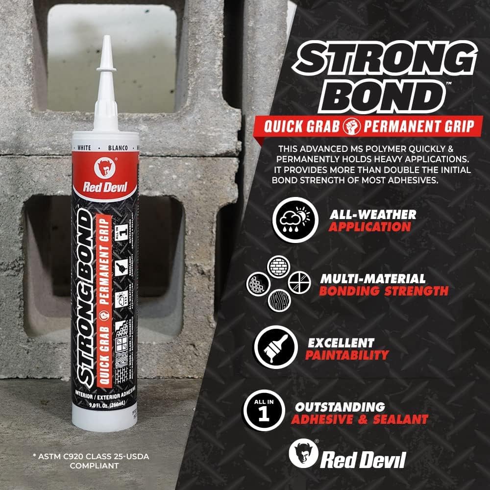 Specially formulated with premium performance in mind, this advanced hybrid polymer technology holds heavy applications quickly and achieves a strong, permanent bond to both porous and non-porous substrates. This all-in-one adhesive and sealant provides more than double the initial bond strength of most other adhesives. Use Strong Bond for fast instant strength, eliminating the need for nails, screws, or fasteners in most applications. Made in the USA.