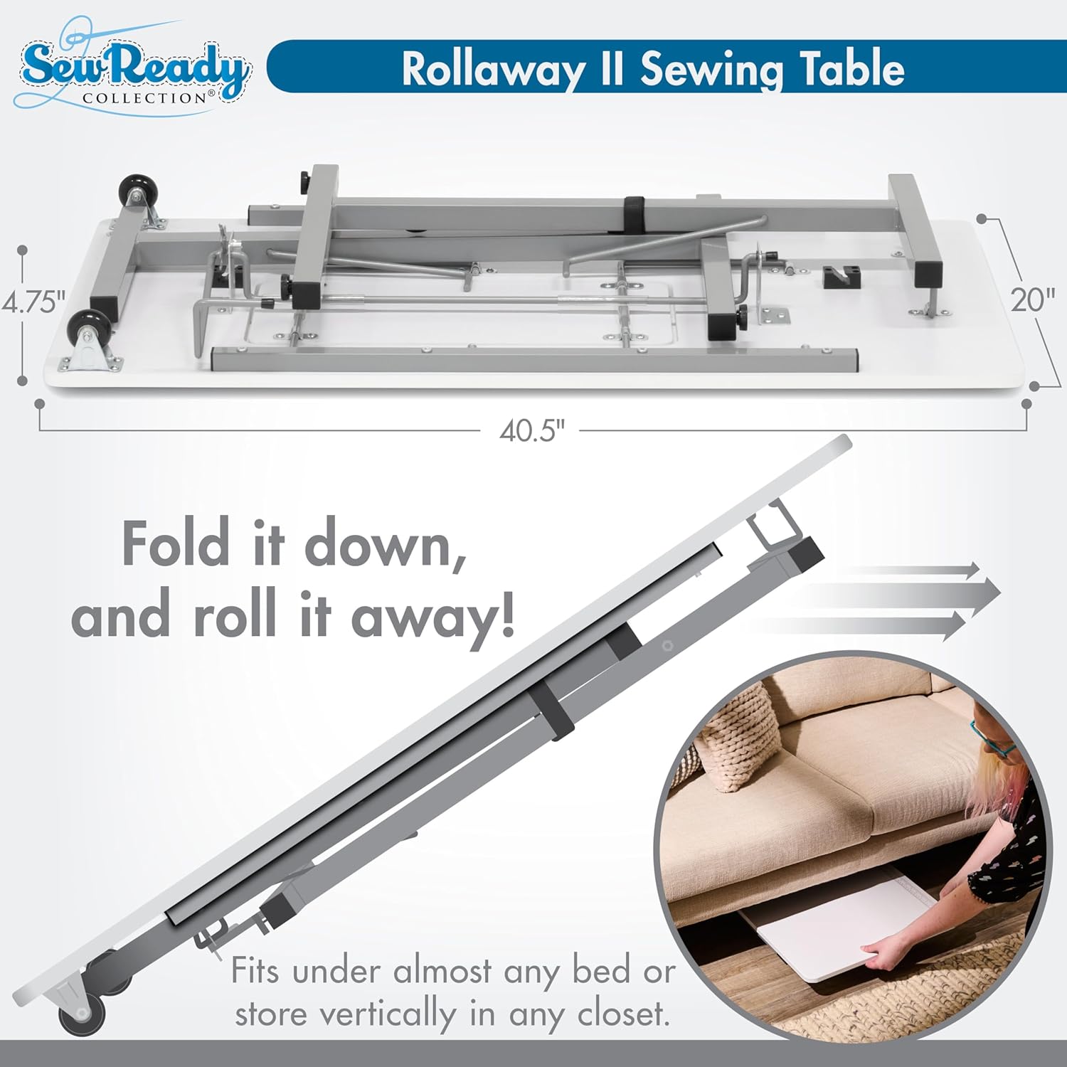 • FOLDING ROLLAWAY SEWING TABLE: Stylish design features a 40.50" wide tabletop with Convenient Sticker with Inch and Centimeter Marks; Perfect for spreading out and diving into a variety of creative projects, including sewing, crafting, and typing on a laptop. Overall Dimensions: 40.50" W x 20" D x 28.25" H (No Assembly Required, Ships Fully Assembled)