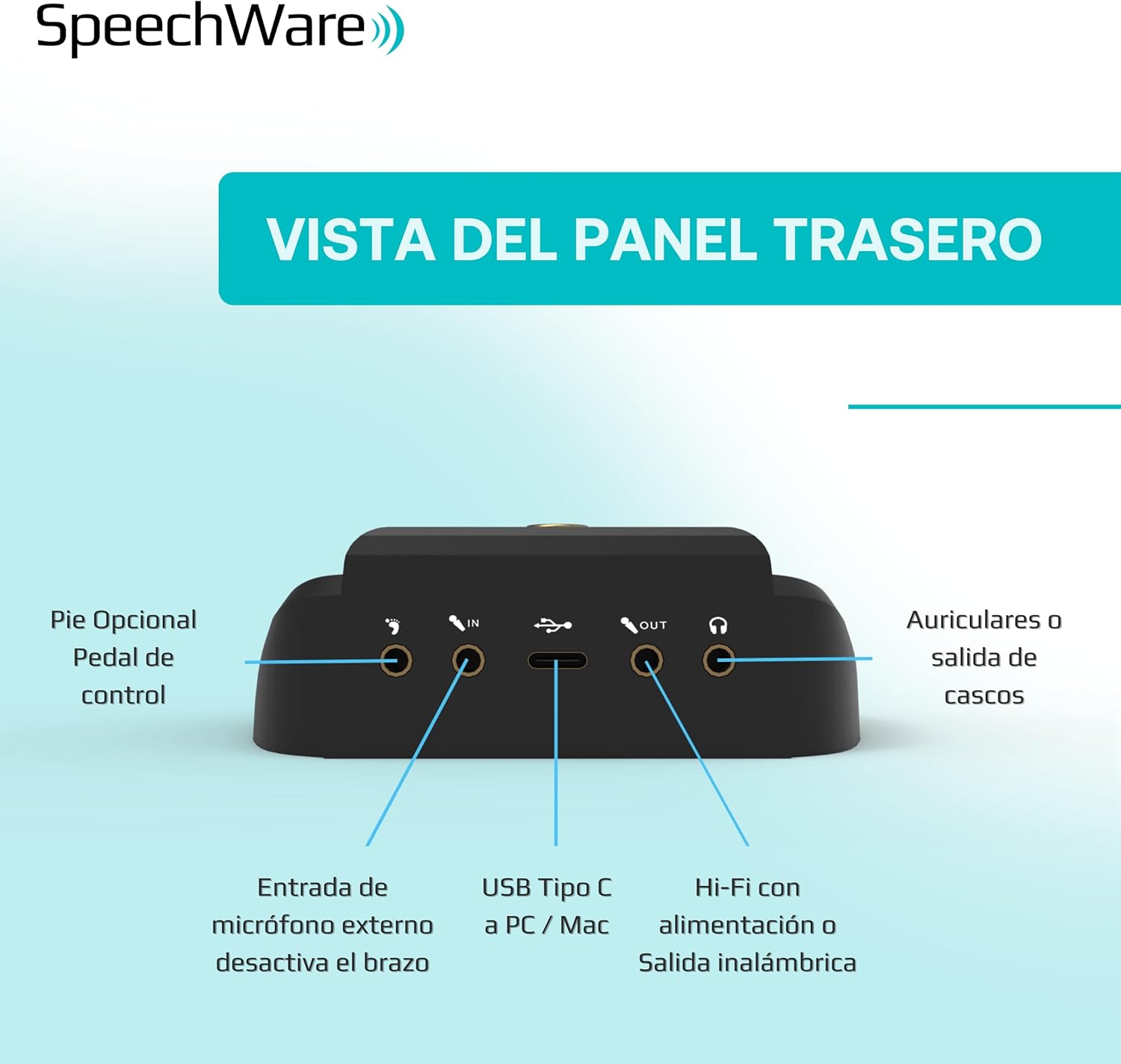 Overview: A high sensitive noise cancelling Desktop Microphone with a USB interface and standard input and output sound jacks. Digital control panel with user programmable volume buttons. Detachable and Interchangeable microphone boom with flexible tip for perfect positioning. Industry first integrated 'Speech Equaliser (EQ)' and 'Automatic Gain Control (AGC)' or Amplifier for long and variable range dictation. Wideband and 20 kHz High Definition VoIP. Insulated USB cable with gold plated connectors. Two-year warranty. The new SpeechWare USB 3-in-1 TableMike is the collaborative result of several years of the best European design informed with continuous input from numerous experienced speech recognition resellers and users worldwide. Awarded a Best in class "5 Dragons" certification by Nuance, the developer of Dragon NaturallySpeaking. The TableMike was recognised as the Best microphone with "4.5 mice" by the leading American computing magazine MacWorld US. In Europe, the German publication MacWelt explicitly highlighted the excellent accuracy of the TableMike with Dragon Dictate 3, along with the freedom of movement during dictation -"SpeechMatic" technology. Features : USB Desktop Microphone with standard 3.5 mm Mic input and output sound jacks Detachable and interchangeable flexible microphone boom (40 cm or 16") for easier removal, portability and storage Industry first integrated 'Speech Equaliser (EQ)' and 'Automatic Gain Control (AGC)' or Amplifier for superior performance with Speech recognition, Voice recording and wideband or 20 kHz High Definition (HD) Voice over IP (VoIP) or Internet telephony. The combination of the EQ & AGC delivers very high recognition accuracy from 10 cm up to 50 cm (4" to 20") range, depending upon voice volume and ambient noise, comparable to that of the best headsets. Unlike conventional microphones, which require keeping al