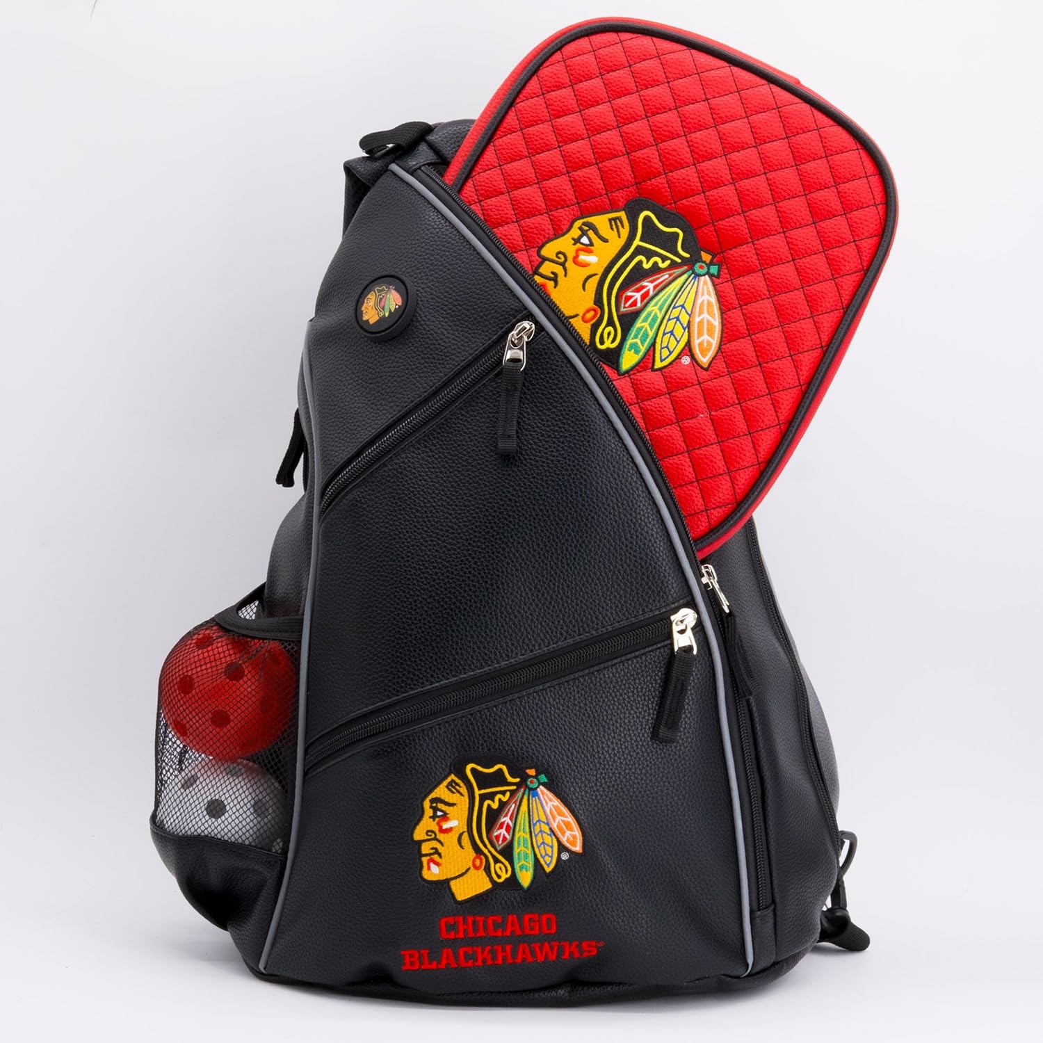 The PU Leather Embroidered Team Backpack features a magnetic towel catch, five zippered pockets and four internal mesh pockets, water bottle pocket and ergonomically designed straps for shoulder or cross-body carry.