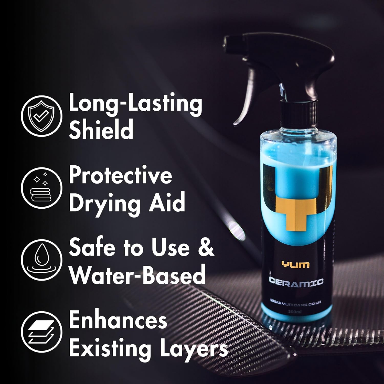 Yum Ceramic Spray Sealant is a next-generation spray coating that brings the power of ceramic technology into a simple, effective format for daily drivers and detailers alike. Designed for maximum usability, it offers an easy spray-on, wipe-off application that provides high gloss, impressive slickness, and long-lasting protection across a wide range of exterior vehicle surfaces. Whether you are maintaining a weekend show car or protecting a daily commuter, Yum Ceramic creates a water-repellent barrier that resists dirt, dust, bird droppings, and other environmental contaminants. It leaves behind a smooth finish that feels silky to the touch and reflects light with clarity and depth. Thanks to its advanced chemistry, it instantly enhances visual appearance while defending the surface beneath. Unlike traditional ceramic coatings that require lengthy curing times or advanced application techniques, Yum Ceramic is made for convenience. Just spray onto a clean surface, spread with a microfiber towel, and buff off any remaining residue. There is no need for leveling, multi-step curing, or complex preparation beyond a clean vehicle surface. The product is safe to use on clear coats, painted plastics, trim, glass, wheels, and existing ceramic coatings. It also performs well on uncoated vehicles, giving them the high-gloss look and water-repelling benefits of a ceramic-style finish, without the commitment of a permanent coating. Whether used as a standalone protectant or as a topper for existing coatings, Yum Ceramic is versatile, fast, and reliable. Crafted by YumCars, a trusted name in premium car care, this spray coating is the result of careful formulation and user-focused design. It represents the balance of performance and practicality, offering long-term results with minimal effort.