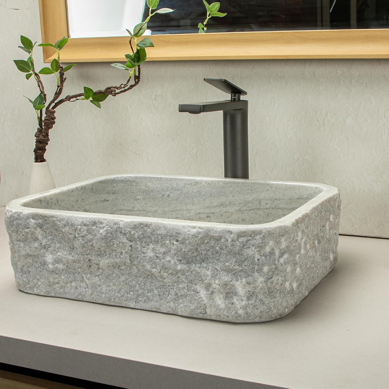 Timeless Elegance with Rustic Charm Introducing our Rustic White Striped-style Rectangular Vessel Sink, designed to add a touch of timeless elegance and rustic charm to your space. The rectangular shape with sharp and defined lines captures attention and creates visual interest. The white striped-style, combined with the coarse and rustic texture, adds a unique touch of natural imperfections and ruggedness, perfect for those who appreciate the beauty of nature in their home. Farmhouse Style and Easy Installation With its farmhouse installation style, our sink is ideal for creating a rustic and charming atmosphere in your bathroom. The easy-to-clean polished surface ensures a pristine appearance with minimal effort. The user-friendly smooth rim adds comfort and convenience, making it a pleasure to use. We offer a 100% warranty guarantee, reflecting our confidence in the quality and durability of our product. Durability and Natural Beauty Crafted from natural stone, our sink combines durability with the timeless appeal of white. It is highly resistant to stains and scratches, maintaining its beauty over time. The sink's acid resistance allows for easy maintenance with various bathroom cleaning products. With its solid and durable construction, it guarantees long-lasting durability, ensuring it remains a reliable fixture in your bathroom for years to come. Appeal to Discerning Customers Our sink caters to customers who appreciate sharp and defined lines, visual interest, and texture in their sink. It satisfies the desire for a sink with a rough and textured surface that adds character to the space. Handmade enthusiasts, natural and eco-friendly home decor enthusiasts, and design-conscious individuals appreciating natural textures will find this sink ideal. It is also perfect for homeowners seeking durable and long-lasting fixtures and customers looking for sturdy and reliable sink options. This sink is the perfect choice for those who desire a visually striking and unique sink installation, elevating their space with rustic elegance. Elevate your bathroom with the Rustic White Striped-style Rectangular Vessel Sink, combining timeless elegance with rustic charm. With its sharp lines, rugged texture, and durable construction, this sink caters to discerning customers who appreciate the natural beauty and imperfections of stone. Experience the perfect blend of style, functionality, and durability in your bathroom today!