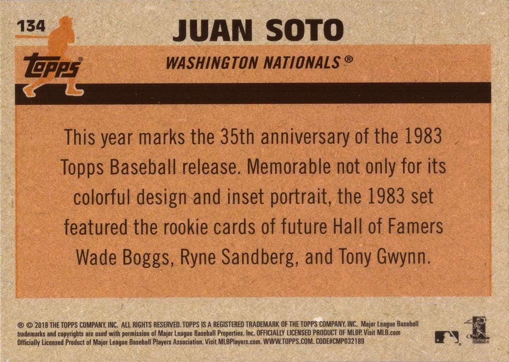 2018 Topps Update 1983 Design Chrome Silver Refractor 35th Anniversary #134 Juan Soto Baseball Rookie Card - Washington Nationals. This is an original, authentic baseball card of Juan Soto produced by Topps in 2018. Along the left edge about halfway down you will see the official RC logo, indicating that this is a true Rookie Card. Card is in Near Mint to Mint condition. Stock photo shown.