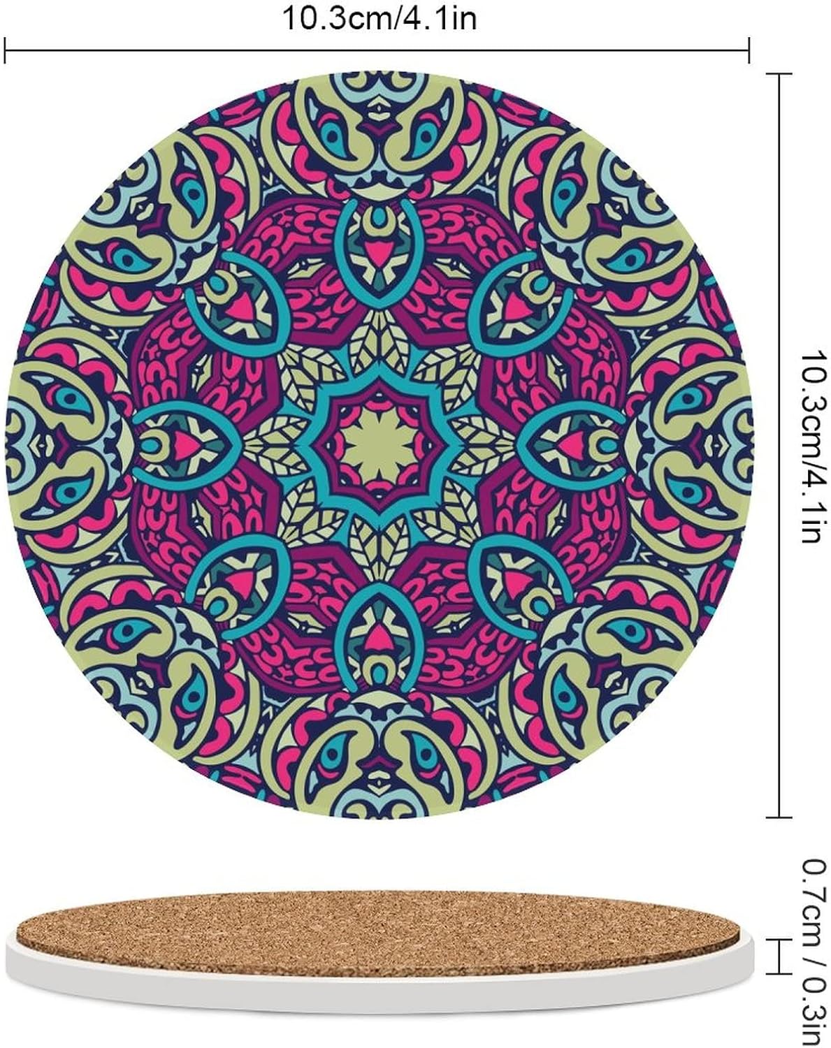 ENJOYING YOUR DRINKS BEGIN WITH USING GOKAYS COASTERS.Although you may not be aware, the tables on which you place the drinks become gradually damage if you aren’t using coasters, particularly the ones made of wood. Whether you’re a coffee fiend or beer enthusiast, having good coaster is necessary to prevent watermarks from forming on your tables.SPECIFICATIONS - Size:4 Inch/10 CM - Package:6PCS - Material:Ceramic - Design:Abstract Boho Festive Mandala Style Purple Green FloralWHY CHOOSE GOKAYS DRINK COASTERS?✔PREMIUM CERAMIC TOP - The ceramic top can absorb coffee stains in 5-10 seconds. - More durable than other coaster made of all-cork. - Easy to Clean, stubborn on ceramic topstains can be wiped by wet towel or brush.✔CORK BOTTOM - Prevent ceramic from scratching the table. - NON-SLIP FEATURE that does not slip even on a smooth table.✔GREAT DESIGN - Not solely a coaster set, but also a decorative element. Featuring with rustic design, these coasters will look adorable on your table, and liven up your rustic table décor.✔WIDE APPLICATION - Coasters with a big 4 inches (10cm) diameter size match almost all types of cups and mugs, making them fit with coffee cups, kids' drinks, sports bottles, craft cocktails, or tumblers.✔BEST GIFT - Great idea for gifts for friends' birthday, housewarming, wedding, mother's day, father's day, Christmas, Thanksgiving Day and other memorable days. As creative gifts, our ceramic coasters will match almost any decor in your home.