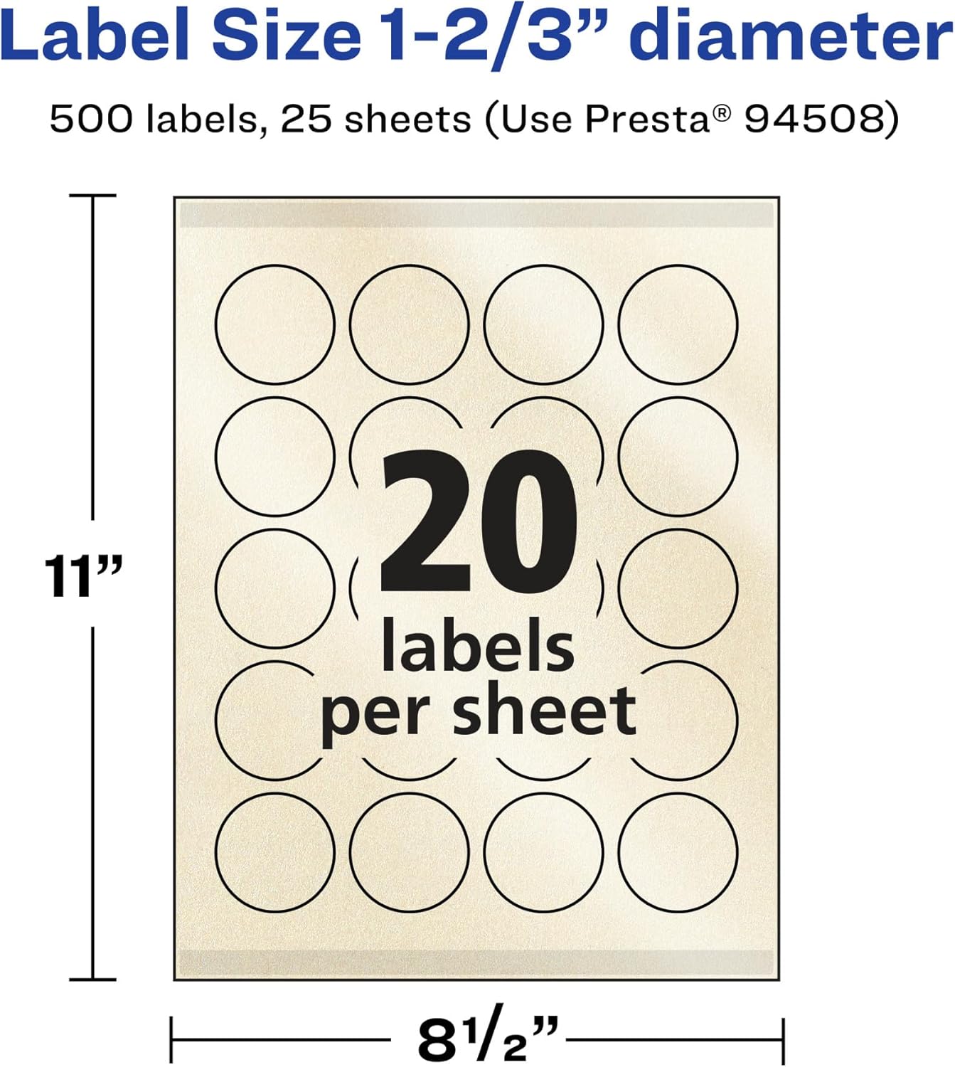 Add an elegant touch to wedding labels, mailing seals, candle labels, pricing labels, soap labels, product labels, round spice labels, mason jar labels and more with Avery 1-2/3" diameter Pearlized Ivory Round Labels. The finish of the pearlized ivory material reflects light with a radiant glow that elevates any project. Avery round labels are carefully constructed with patented features to provide the best results. Sure Feed technology reduces jams or smudges by creating a more reliable feed through your printer. The print-to-the-edge layout lets you print beautiful full-bleed designs that fill each blank sticker to the edge. The Pop-Up Edge lets you fold the sheet back to pop up the edges of each label for faster peeling. The strong permanent label adhesive makes sure that your labels stick and stay without peeling, curling or falling off. Dual-compatible with both laser printers and inkjet printers. Easily customize labels with your own designs, art, symbols and messaging by using the label templates and designs in Avery Design & Print. Whether you're looking for elegant wedding labels or premium product labels that will grab people's attention, Avery Pearlized Ivory Labels are the perfect choice for any project or event.