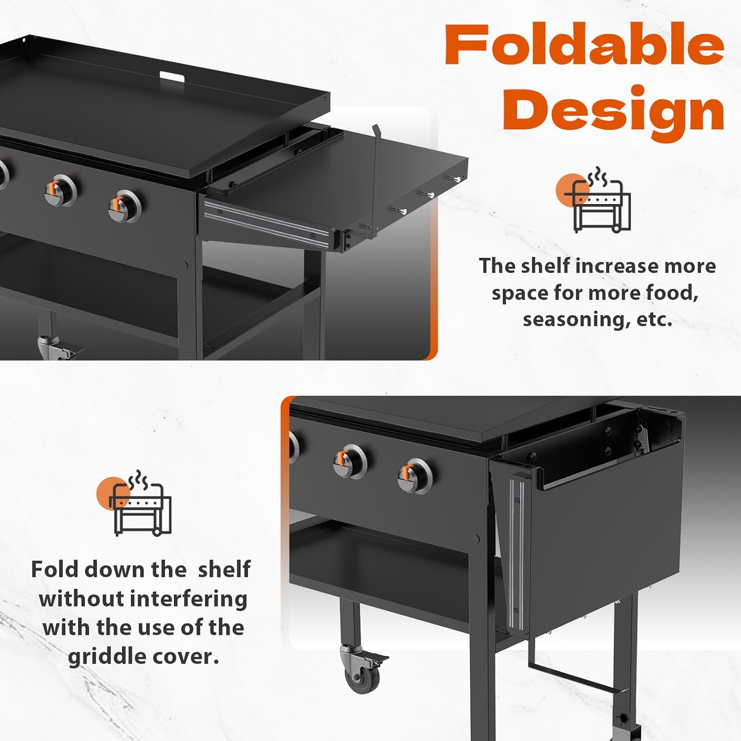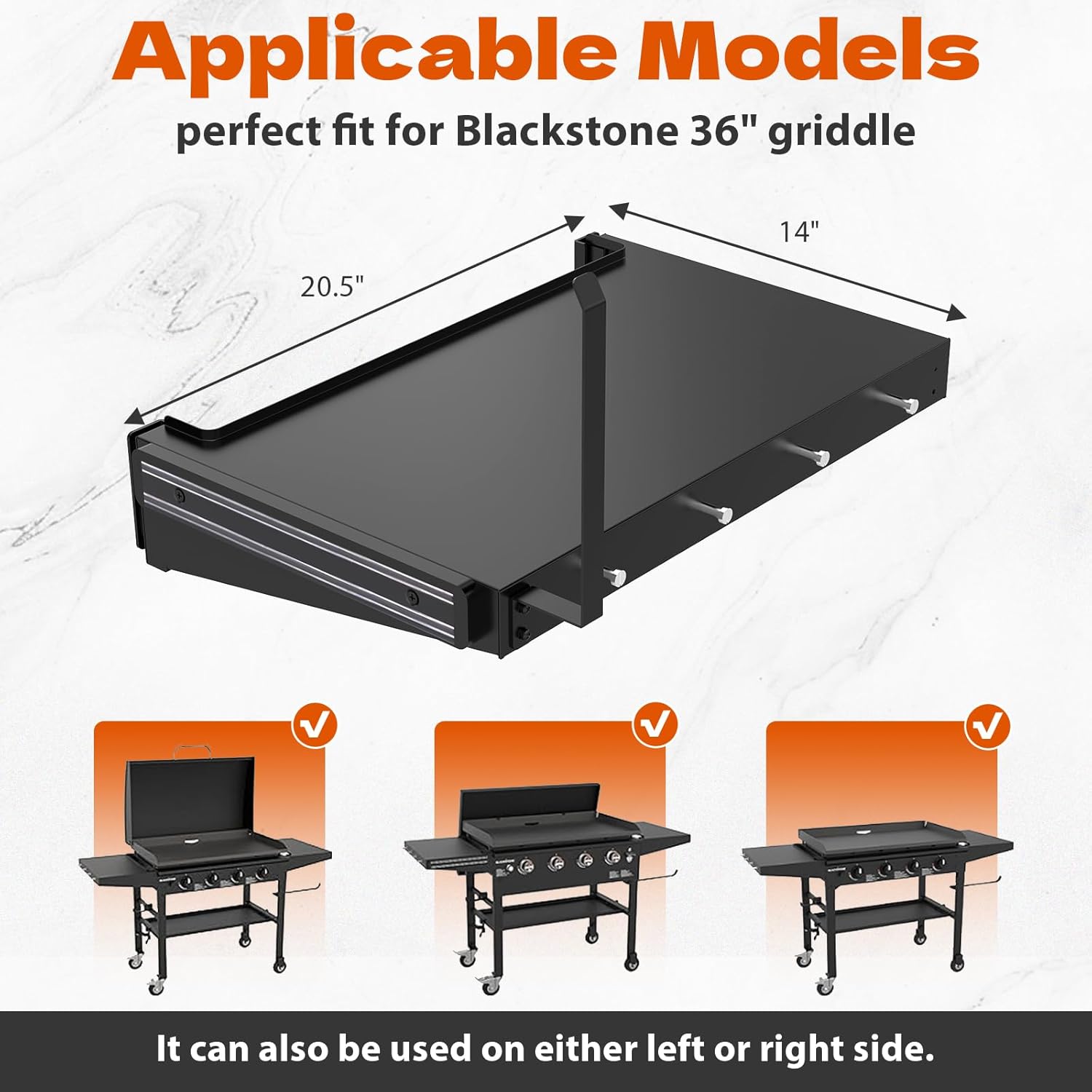 Foldable Griddle Side Shelf for Blackstone 36" Griddle 【Perfect Fit】The Griddle side shelf perfect fit for blackstone 36" griddle. The griddle accessories can also be used on either left or right side.【more storage space】the griddle caddy shelf is 14"*20.5", which Enables you to have more storage space 【Foldable】the griddle accessories is foldable,when not in use, it can be folded down without affecting your ability to use the handles, and also does not interfere with your use of the griddle cover to cover the whole griddle 【More functions】- The griddle side shelves have Paper Towel Holder, 4 Hooks and magnetic tool holder, You can put paper towels and hang some BBQ cookware, etc. to make your BBQ more convenient Universal Hinged Lid with Handle for Blackstone and Other 36 Inch Griddle 【Perfect Fit】The Griddle lid for blackstone 36 inch griddle perfect fit for blackstone 36" griddle and other brands 36" griddle, such as for blackstone 1825 1818 1836 1899 1863 1866 2122 1923 1565 1554 1560 2149 1841, for Member Mark 36 inch griddle, for Nexgrill 36" griddle, etc. 【Anti-reptile Baffle】- The hinged lid for blackstone 36" griddle has Anti-reptile Baffle, it can prevent small reptiles and animals from crawling in and dirtying the griddle, and it also blocks some of the rain from entering.【Reinforced Structure】the griddle accessories hard cover hood for blackstone is made of high-quality steel, and has reinforced structure to avoid deformation.【Anti-Scald stainless steel handle】the griddle hood has a Anti-Scald stainless steel handle, which make your cooking wasier and more convenient.