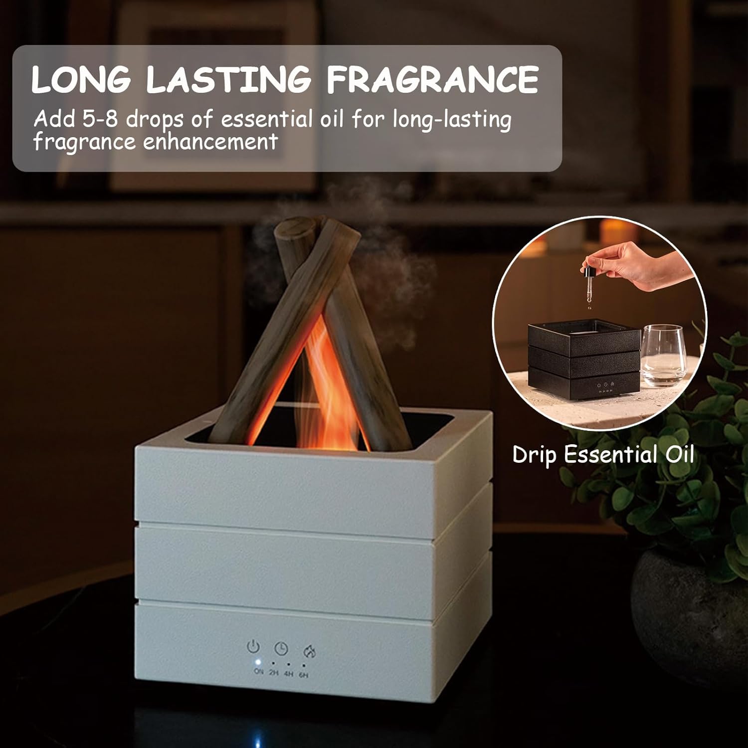 Product Features The Ideal Gift This aromatherapy diffuser features a campfire shape and unique flame design, integrating multiple functions such as humidification, aromatherapy diffusion, 7-color flame night lights, indoor decoration, etc. It is easy to operate, safe to use, and convenient to use. It is an ideal gift for family, friends, or colleagues on holidays such as birthdays, Christmas, Halloween, Thanksgiving, and New Year. Precautions for Use 1.Please add water before use. Do not use in the absence of water. 2.The maximum design capacity of the water tank is 280 milliliters. Do not exceed the maximum water level shown on the external mark of the water tank, as this may affect the spray effect or cause leakage and damage the machine. 3.Please clean the equipment regularly. Generally, it is recommended to use it 5-6 times or clean it every 3-5 days. 4. When not in use for a long time, please unplug the power adapter andrain the water from the tank. 5.Do not pour water directly into the mist outlet,otherwise the machine may be damaged! Product Information Place of Origin: China Main Color: White & Black Main Material: ABS+PP Capacity: 280ml Spray Volume:30-45ml/H Net Weight: 1.02pounds Size: 5.27*5.27*8.31inches Package 1 X Aroma Diffuser 1 X Power Cord 1 X Remote Control (without Battery) 1 X Manual 24-Hour Customer Service We provides excellent customer service. You can rest assured to buy our products, if you have any questions about the aroma diffuser, please contact us, we will reply you within 24 hours and solve your problem.