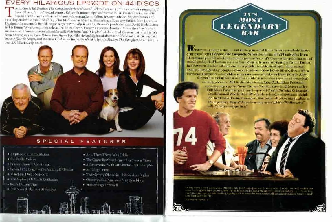 Wander in...pull up a stool...and make yourself at home where everybody knows your name with Cheers: The Complete Series, featuring all 270 episodes from 11 seasons, plus a host of exciting featurettes on 45 discs with vivid picture and sound quality. Ted Danson stars as Sam Malone, former relief-pitcher for the Boston Red Sox turned sober saloon owner of a popular neighborhood spot. Add a colorful cast of co-stars (Shelley Long, Kirstie Alley, Rhea Perlman, George Wendt, John Ratzenberger, Nicholas Colasanto, Woody Harrelson, and Kelsey Grammer) and you're all set to raise a glass to the legendary, 28-time Emmy Award -winning series GQ Magazine calls pretty much perfect. Psychiatrist and "Cheers" regular Dr. Frasier Crane (Kelsey Grammer) left Boston for his hometown of Seattle and a job as a radio call-in show host, in this hit 1993-2004 spin-off. Thanks to brother Niles (David Hyde Pierce), dad Martin (John Mahoney), health care worker Daphne (Jane Leeves), and radio producer Roz (Peri Gilpin), though, things were just as aggravating on the West Coast.258 episodes on 44 discs. 98 1/4 hrs. Standard; Soundtrack: English Dolby Digital stereo.