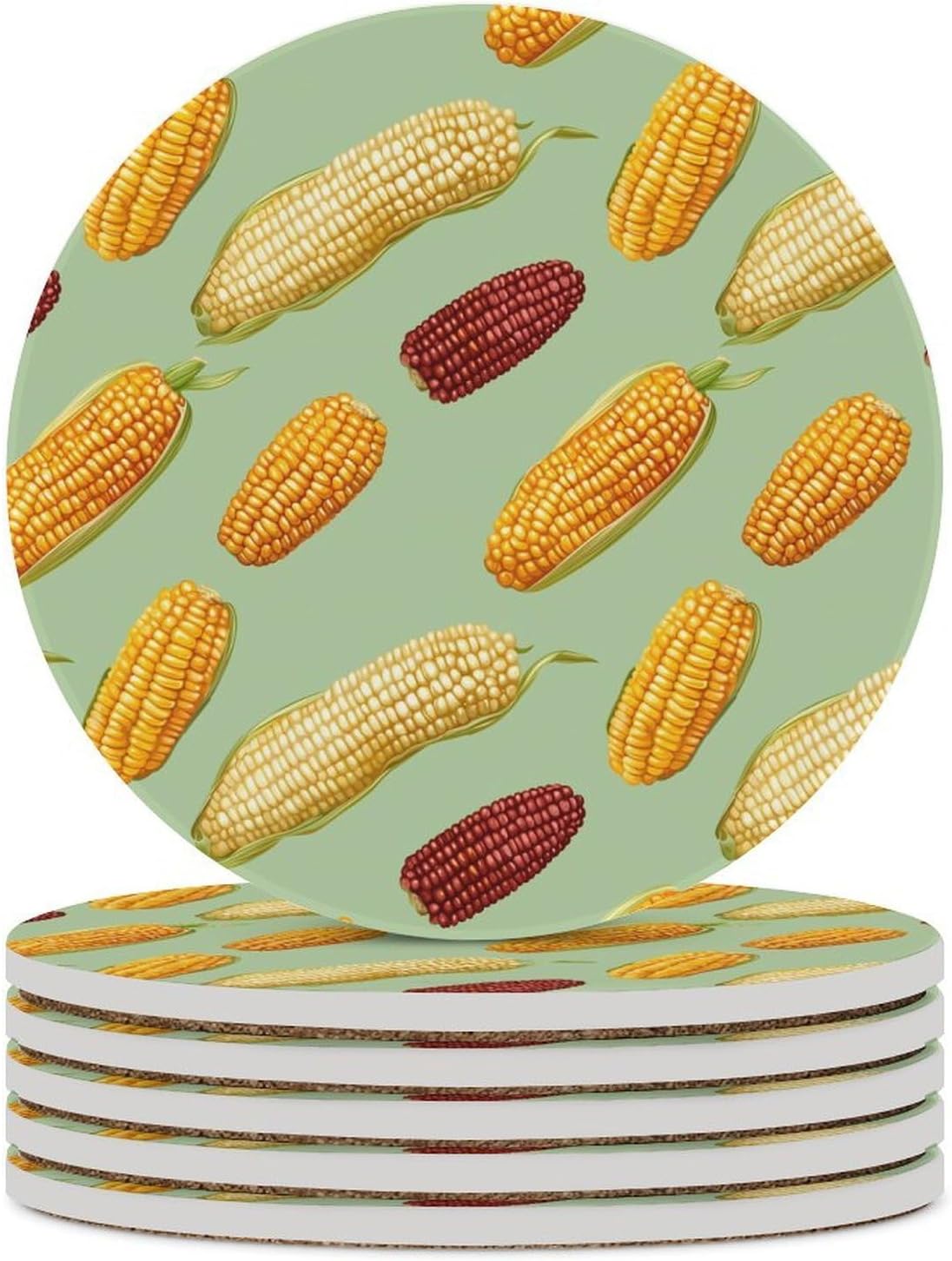Corn Cobs Round Ceramic Coasters for Drinks Absorbent Cup Holder Tabletop Protector with Cork Base