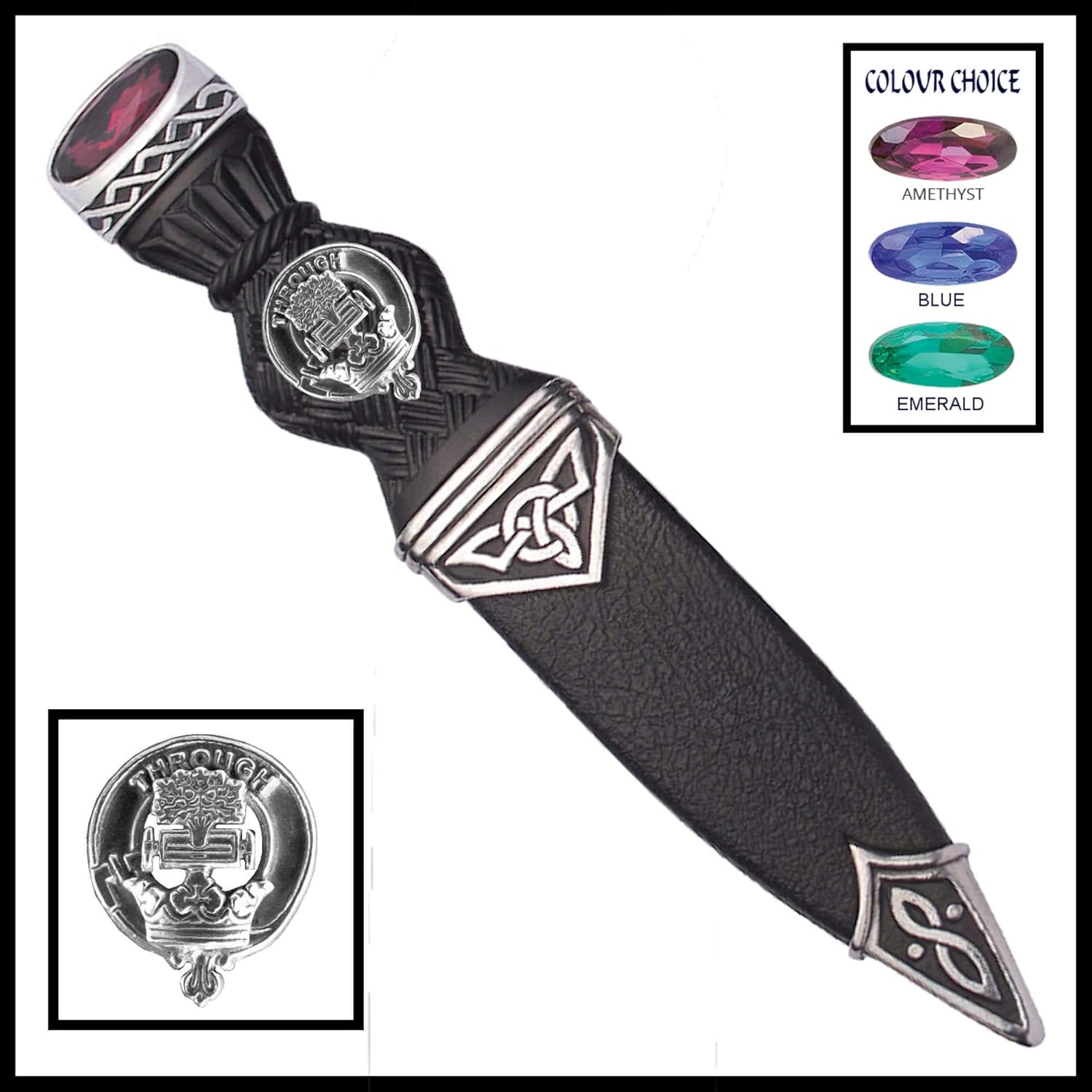 SCOTTISH CLAN CREST HIGHER QUALITY SGIAN DUBH This sgian dubh is made by The Sgian Dubh Company in Scotland and is the highest quality sgian dubh on the market today. Each comes in its own high quality blue presentation box. Clearly "Made in Scotland". This beautiful Sgian Dubh or traditional Scottish black handled knife is available mounted with your Clan crest in lead free pewter or fine sterling silver, all Clans are available. This is our high end Sgian dubh, it is very well made with the handle and sheath made of a resin and plated metal fittings. This brand new Sgian Dubh is 7 1/2” (190 mm) long by 1 3/8” (35 mm) wide with a stainless steel blade and nickel silver plated fittings. The top has an imitation glass stone in blue sapphire, emerald green or purple amethyst. Select the colour you want when ordering The Clan crest is surrounded by a detailed belt and buckle design upon which is inscribed your clan motto in raised relief lettering. Each piece is exquisitely handcrafted in high detail in sterling silver. The Clan Crest is 11/16" (19.5 mm) in diameter. In ancient times, the chief of the Clan presented to his clansmen his crest for them to wear as a symbol of their loyalty and Clan affiliation. THE HISTORY OF THE SGIAN DUBH The distant origins of the name Sgian Dubh (Gaelic for Black Knife) are thought to have emerged from the knife's dark appearance - the early handles were often hand carved from black bog wood and the blade would become dark through use and age. A second theory is that it originated from the dark or sinister nature of an easily concealed weapon - which is why it has become traditional to keep the Sgian Dubh in open view in the top of the stocking whilst wearing Highland attire to show that its wearer is among friends and has no ill intent. The Sgian Dubh was not, is not and should not be considered a weapon!
