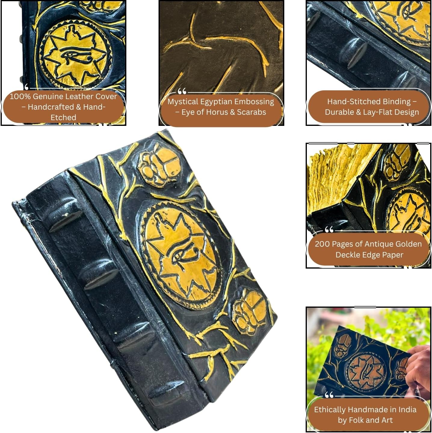 Unlock the Ancient Power Within – The Scarab Prophecy by Folk and Art Step into a world of mysticism, prophecy, and sacred storytelling with The Scarab Prophecy – a handmade leather journal inspired by the divine symbolism of ancient Egypt. Adorned with the powerful Eye of Horus and golden scarab beetles, this one-of-a-kind notebook is more than a journal—it’s a spiritual artifact. The journal’s black genuine leather cover is hand-embossed with golden vine branches, giving it an enchanted, gothic feel. These gold accents branch out around deeply symbolic icons: the Eye of Horus representing protection and insight, and the Scarab representing rebirth and transformation. Inside, you’ll discover 200 pages of thick, antique-style handmade paper, with raw deckle edges and a golden tint—perfect for: ✍️ Journaling, poetry, or personal thoughts 🧙♀️ Spellwork, shadow work, and rituals 🔮 Tarot readings, affirmations, or dreams 🎨 Sketches, visions, and sacred art This journal is a must-have for Wiccans, witches, pagans, spiritual seekers, and anyone drawn to ancient magic and gothic elegance. Whether you use it as a grimoire, spellbook, dream diary, or personal oracle, it holds the energy of sacred intention. Proudly handcrafted by Indian artisans under the Folk and Art brand (a part of Signature Stitch Pvt Ltd), each journal is made using 100% real leather and eco-conscious materials—bringing timeless beauty, ethical craftsmanship, and mystical purpose into one magical creation.