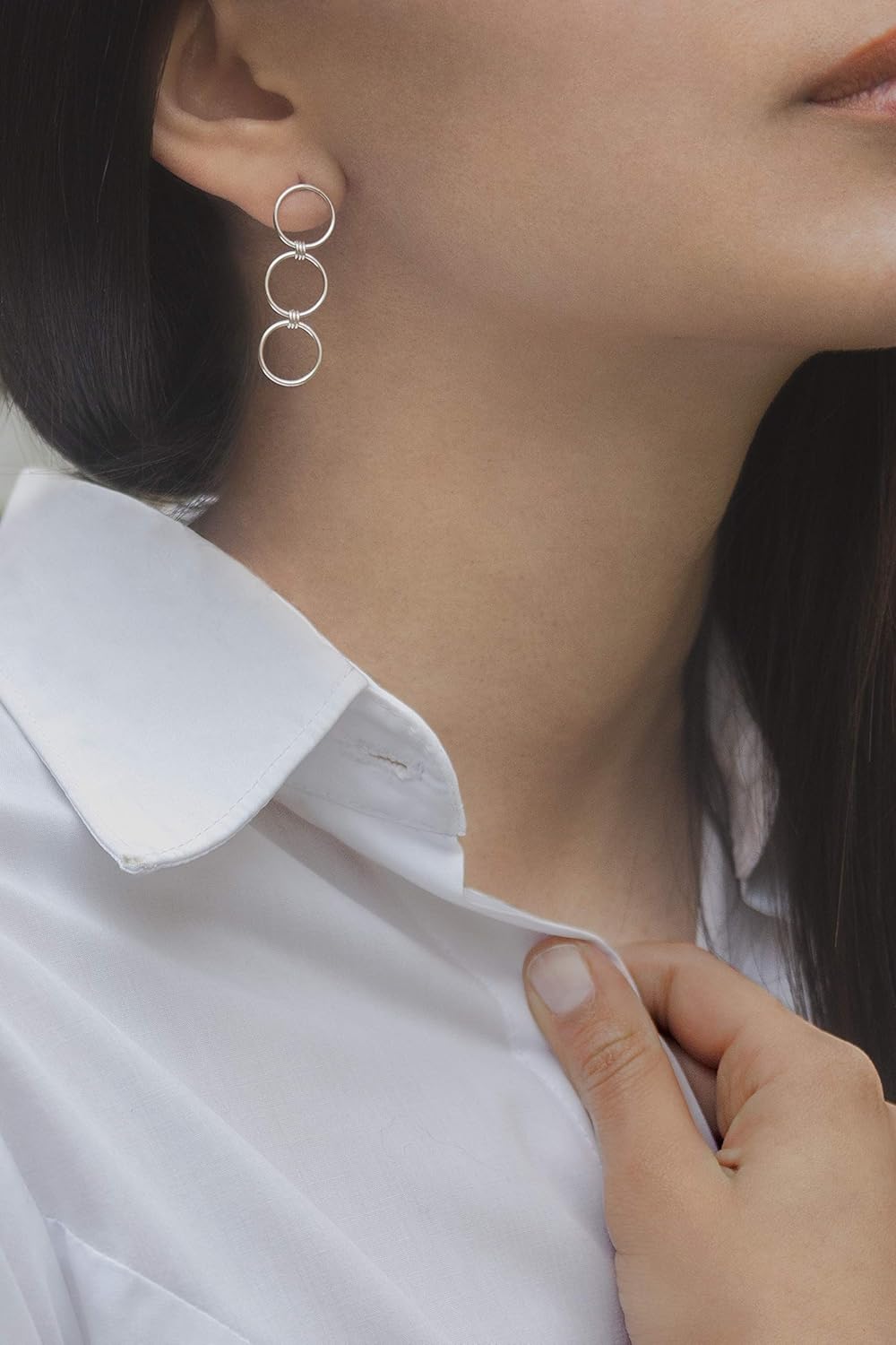 Get ready for compliments on these trendy triple-circle earrings! Perfect from business casual to everyday wear. These stud dangle earrings are handcrafted and affordable Simple and minimalist made in Sterling Silver 925, three dangling hoops in polished finish The three rings are linked together by three tiny rings, 1.5 inches long Light weight, comfortable for everyday Jewelry is delivered in a nice cream colored velvet draw string gift bag/pouch Exclusive design carefully handmade in Peru Nothing like handmade one of a kind jewelry for a Special Person. Perfect Gift Ideas for Birthday, Valentine's Day, Graduation, Mother's Day, Anniversary, Gift for Teens.CLAUDIA LIRA is a talented and recognized jewelry designer from Lima, Peru. At Claudia Lira Joyas you will find a selection of high quality, impeccable finish, handmade rings, necklaces, pendants, bracelets, and earrings all crafted in high quality 925 Sterling Silver. Claudia Lira transforms silver into sophisticated, contemporary designs. Make a statement with unique simple designs - every day! Modern everyday jewelry designed and handmade in Peru.HOW TO CARE FOR STERLING SILVER JEWELRY: Proper care includes being conscious of how you store, wear, and clean your jewelry. Do not allow your Sterling Silver jewelry to come into contact with harsh household chemicals such as bleach, ammonia, or chlorine. To avoid scratches and dents, store silver in a lined jewelry bag/pouch; in an area with low humidity as it is prone to naturally tarnish. If you notice any discoloration, we recommend use a gentle polish made specifically for removing tarnish. Also, try cleaning and wearing silver jewelry regularly to help maintain your Sterling Silver jewelry looking brilliant for years to come.