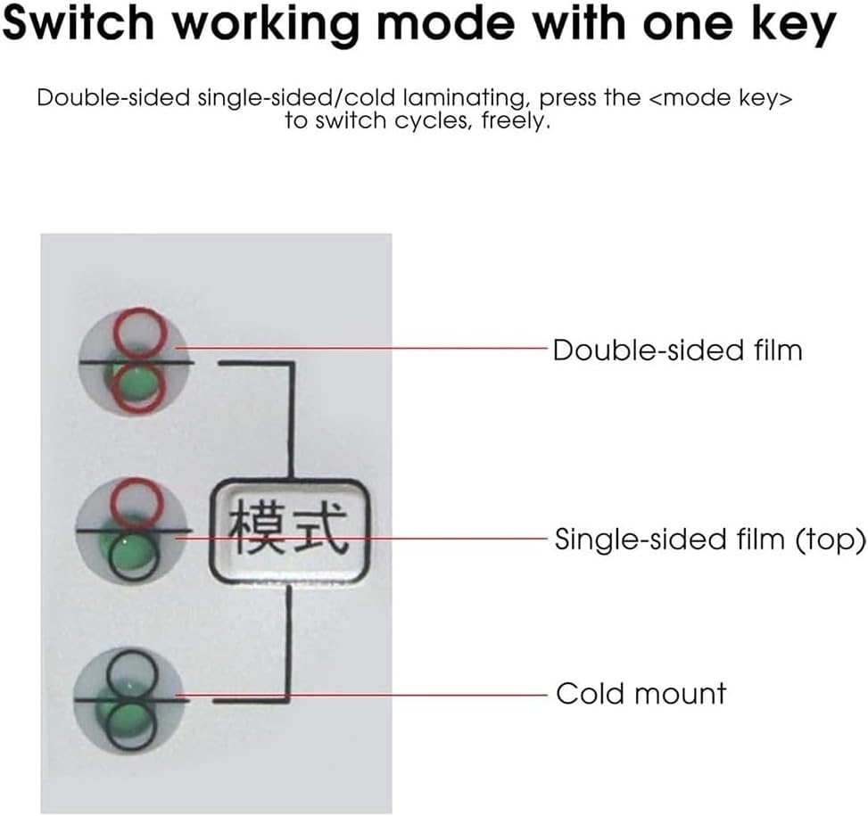Single and double-sided heating mode: In single-sided heating mode, the lower roller is not heated, and the hot melt adhesive on the pre-laminated film that exceeds the paper width will not stick to the lower rubber roller, and it can also reduce the bending phenomenon of single-sided lamination; double-sided heating mode can be used for double-sided lamination. Specification Machine name: small laminating machine Power supply: 220V Power consumption: 700W Laminating size: 350mm widest Laminating speed: about 1.1 meters/minute Working temperature: 0*-180℃ (laminated 100-140 degrees; cold lamination: room temperature) Film core specification: 1 inch (2.54 cm) in diameter Base materials: BOPP pre-coating film, PET pre-coating film, DBW glossy film, etc Temperature control method: electronic temperature control, digital display Working mode: cold lamination, single-sided lamination, double-sided lamination Laminating thickness: 0.1-5mm Machine size: 530 x 210 x 220mm Machine weight: 7kg Package list: 1 x V350 Hot Cold Roll Laminator