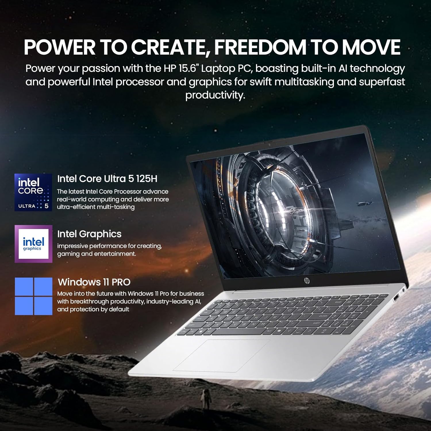 Do more from anywhere, all-day long. Featuring a long lasting battery, fast Wi-Fi 6, and ample storage, the HP 15 laptops keep you productive and entertained wherever you are. With the formidable Intel Core Ultra processor, this Core Ultra 5 laptop offers a seamless experience for both personal and professional use. Perfect for those on the go, it combines a large touch screen with a portable design OS Windows 11 Pro 64-bit - elevate your workstyle and productivity with AI-powered breakthroughs and immersive workflows Processor Intel Core Ultra 5 (14 cores, 18 threads, up to 4.5GHz) - superior multi-tasking performance Memory & Storage 16 GB DDR4 RAM - easy multitasking, seamless browsing and streaming 1 TB PCIe SSD - fast bootup and ample storage Display & Graphics 15.6" diagonal, FHD (1920 x 1080), touch, IPS, micro-edge, anti-glare Intel Graphics - enhances your professional success with crisp, stunning visuals Features Killer Wi-Fi 6+Bluetooth 5.4 - effortlessly connected Long battery life+HP Fast Charge (50% charge in 45 mins) - work or play all day long HP True Vision 720p HD camera with dual array digital microphones+AI noise reduction - look and sound your best HD Audio with dual stereo speakers - offers cinematic experience Ports & Slots Killer Wi-Fi 6 + Bluetooth 5.4 USB Type-C 10Gbps (PD, DisplayPort 1.4) 2× USB-A 5Gbps HDMI 1.4 Included A Premium Accessory Suite for enhanced productivity Design Full-size keyboard with numeric keypad A slim, sleek, natural silver and contemporary design