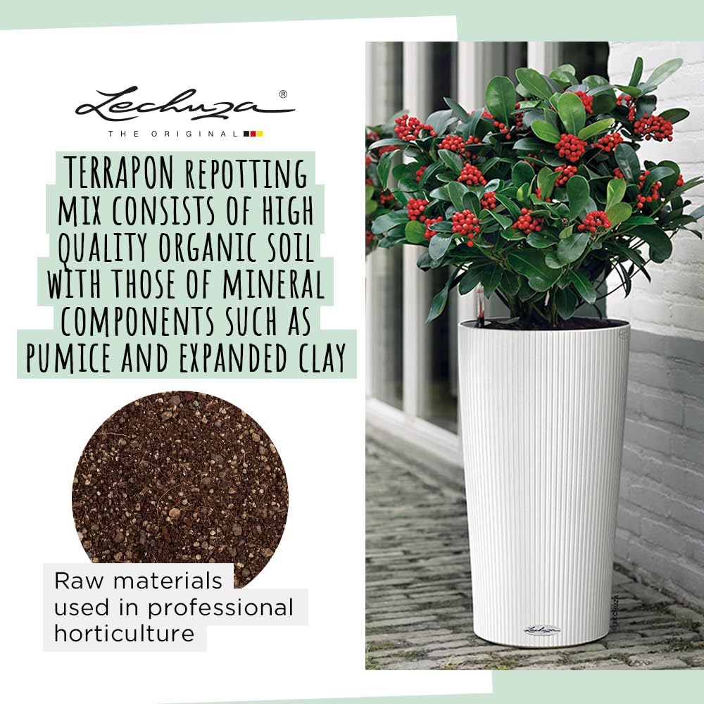 Terrapon 12 litre plant substrate made of humus and mineral components. Item no. 19572 Terrapon combines humus with mineral components. In addition to Pon, Lechuza has developed another high-quality plant substrate that optimally combines the benefits of organic humus with mineral components such as pumice and broken expanded clay: Terrapon. The new substrate is made from high-quality raw materials as used in professional horticulture: pumice, broken expanded clay and an effective fertiliser combination. The proportion of fresh natural clay acts as a natural water and nutrient storage and promotes the even supply of plants. This buffered fluctuations and dry or wet periods are better withstood. For the sake of the environment, the new Terrapon in sizes 6 and 12 litres is now peat-free. Terrapon can be used for planting almost all indoor plants, balcony and garden plants, with the exception of bog beds that place special requirements on the pH value of the substrate. A corresponding special soil should be used here. Orchids, which also place very special requirements on the planting substrate, should be planted in Orchidpon.