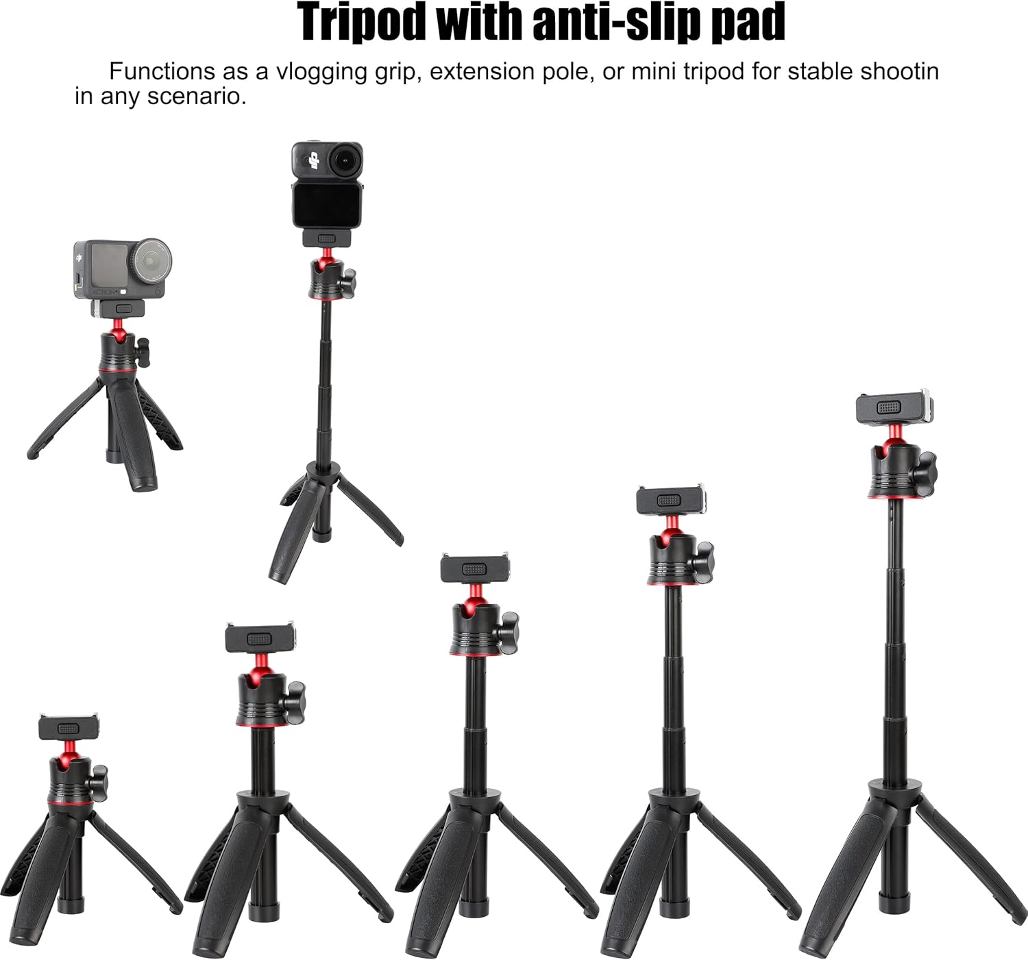 Product Description: The Pellking Quick-Release Extendable Tripod redefines versatility for content creators using DJI Osmo Nano and Action 6 cameras. This all-in-one solution combines a professional-grade tripod with a flexible selfie stick, giving you the freedom to adapt to any shooting situation. ๏ปฟ ๐๐ซ๐๐๐ญ๐ ๐ฐ๐ข๐ญ๐ก ๐๐จ๐ง๐๐ข๐๐๐ง๐๐ Experience flawless compatibility with your DJI equipment. Our specialized quick-release base ensures perfect fit and eliminates connection problems, while the intuitive button lock lets you mount/detach your camera instantly. Transition smoothly between handheld filming and stable tripod setups in seconds. ๏ปฟ ๐๐๐ซ๐๐๐๐ญ ๐๐ง๐ ๐ฅ๐๐ฌ, ๐๐ฏ๐๐ซ๐ฒ ๐๐ข๐ฆ๐ The advanced ball head provides complete 360ยฐ horizontal rotation and 90ยฐ vertical tilt capabilities. Capture sweeping panoramas, low-angle shots, or perfect selfie videos with unprecedented positioning freedom. ๏ปฟ ๐๐๐ฌ๐ข๐ ๐ง๐๐ ๐๐จ๐ซ ๐ญ๐ก๐ ๐๐จ๐๐ข๐ฅ๐ ๐๐ซ๐๐๐ญ๐จ๐ซ With 4 adjustable extension sections, reach your ideal shooting height from 6.69" to 13". The lightweight aluminum construction (only 4.13oz) makes it your perfect travel companion โ ready to deploy whenever inspiration strikes. ๏ปฟ ๐๐จ๐๐ค-๐๐จ๐ฅ๐ข๐ ๐๐ญ๐๐๐ข๐ฅ๐ข๐ญ๐ฒ The tripod base features reinforced support legs with anti-slip silicone padding that grips any surface securely. Enjoy shake-free recording on tables, rocks, or uneven ground โ your camera stays perfectly positioned. ๏ปฟ ๐๐ก๐ซ๐๐ ๐๐จ๐จ๐ฅ๐ฌ ๐ข๐ง ๐๐ง๐ Professional Vlogging Grip for comfortable handheld shooting Extension Pole for elevated perspectives and group selfies Mini Tripod for stable time-lapses and hands-free recording ๏ปฟ Ideal for vloggers, travelers, and social media creators, the Pellking Tripod helps you produce professional-quality content with unmatched convenience. Wherever your creativity takes you, bring this compact powerhouse along for the journey. ๏ปฟ ๐๐๐๐ค๐๐ ๐ ๐๐ง๐๐ฅ๐ฎ๐๐๐ฌ: 1x Pellking Quick-Release Extendable Tripod ๏ปฟ Compatible exclusively with DJI Osmo Nano and DJI Action 6 cameras