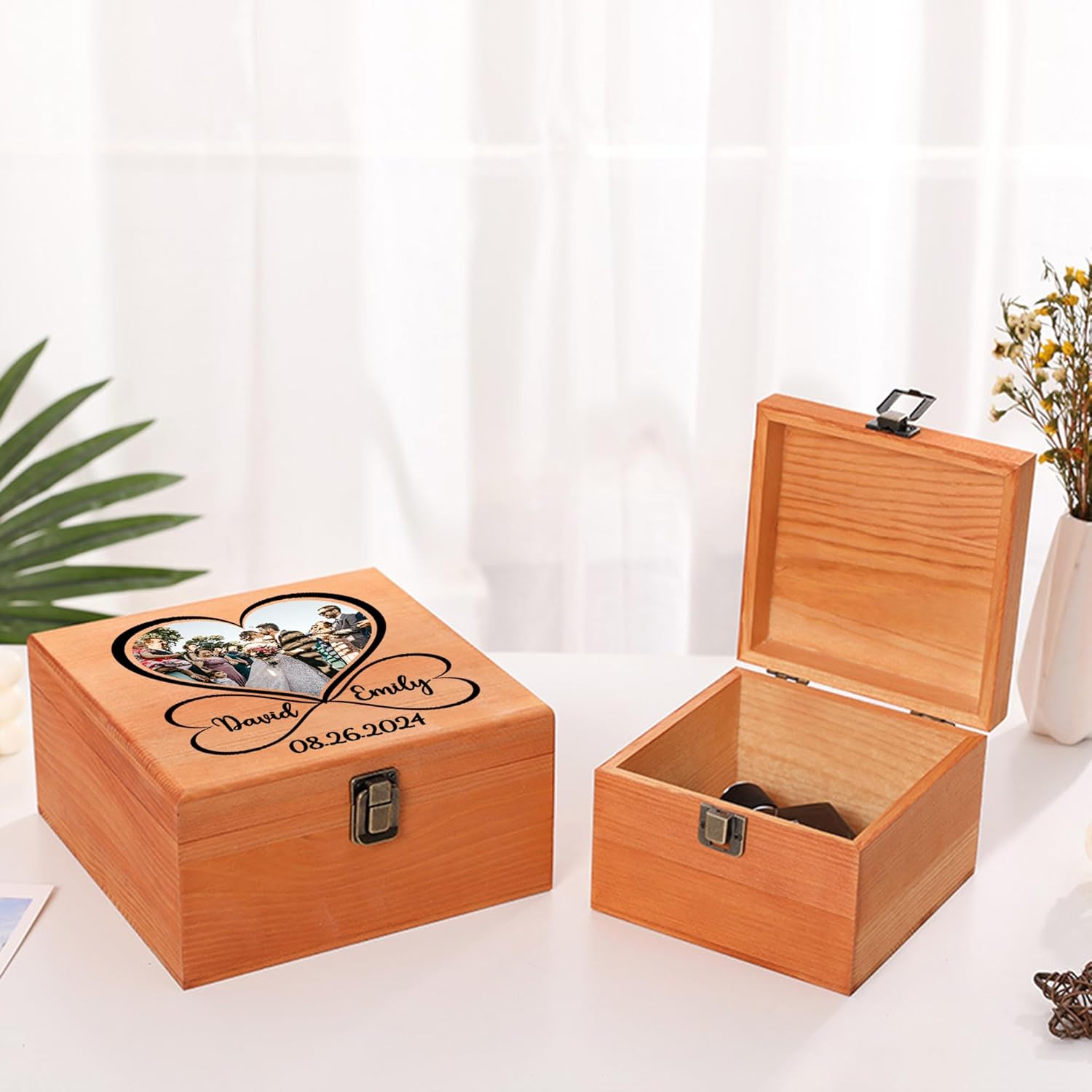 Customized Memory Box You can customize our wooden boxes with any theme photo, such as wedding, honeymoon, Halloween, Christmas, Valentine's Day, engagement, Valentine's Day, housewarming, graduation, cats, dogs, pets and so on. Customize a unique memory box or wooden gift box for your beloved ones! Premium Material Our custom memory boxes are made of high quality pine wood and metal clasps, which can be long lasting and can be treasured as an heirloom for many years. 3 sizes are available in different capacities, brown and white are obtainable to meet different needs and preferences. Unique Gift Beautiful keepsake gifts for women and men to celebrate their big days and holidays. Special Gifts for Mom, Dad, Boyfriend, Girlfriend, BFF, Wife, Husband, Fiancée, Sister, Brother, Bridesmaid, Groomsmen, daughter, son, grandma, papa, daddy, nana, grandson, granddaughter, co-worker, best friend on any day! Customer Service We are confident that our custom wooden boxes will meet all your expectations for a beautiful and special photo wooden box you will receive. If you have any request, please feel free to contact us. We promise to get back to you within 24 hours and provide you with a perfect solution!