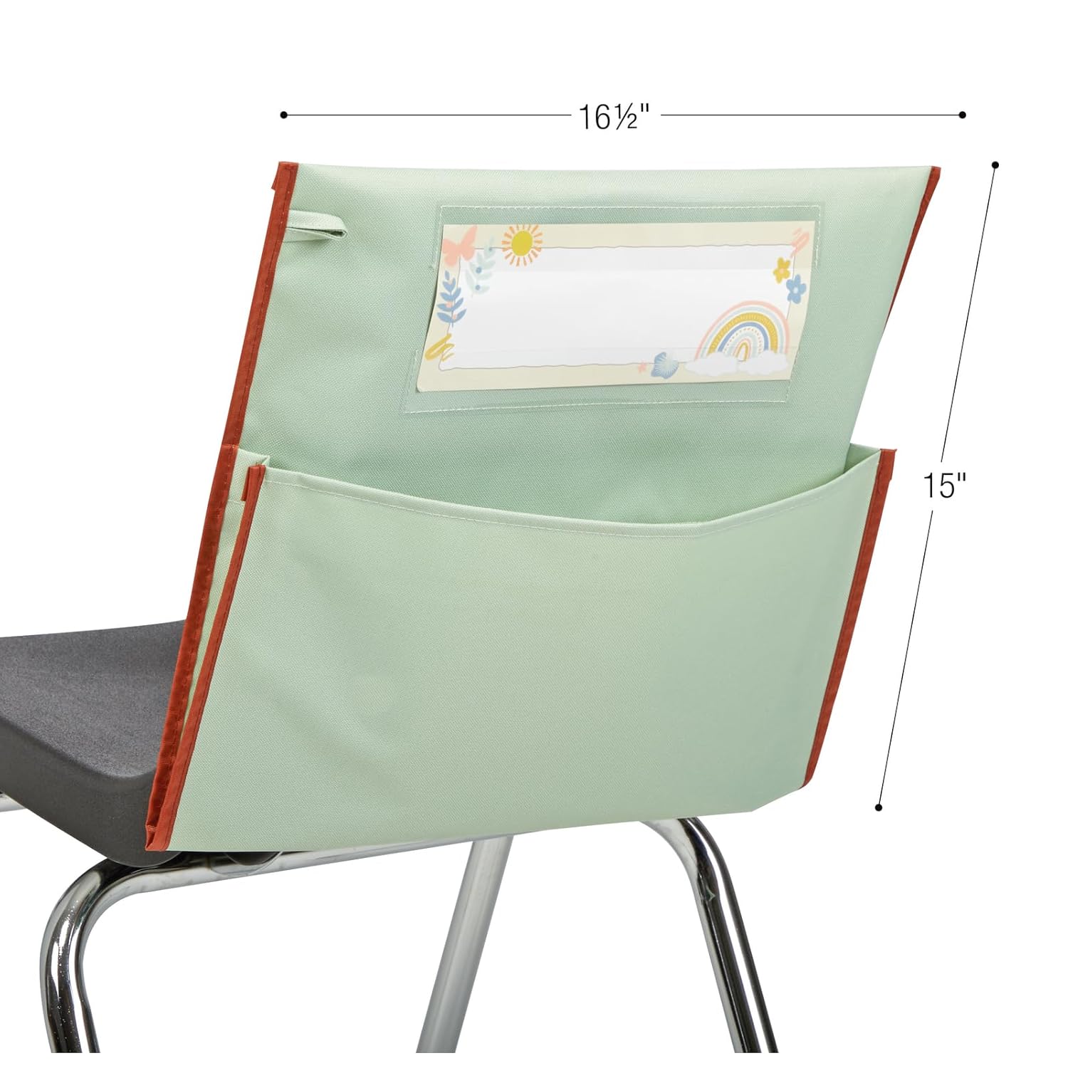 Really Good Stuff chair pockets will add a colorful touch to your classroom décor and keep your room and students organized. The classic boho design is perfect to coordinate with any décor in today’s classroom. This chair pocket won't take up any extra room and will allow students to store books, folders, and more on the backs of their chairs, freeing up space inside their desks. You get a single chair pocket that measures 16.5” x 15”, inside pocket width is 16.5" x 8.5" deep. This chair pocket also comes with a sturdy boho color name tag, Each nametag measures 9.75" x 3.5". Our durable chair pockets are made of strong, woven polyester and nylon fabric designed to withstand whatever your students can dish out. Spot clean with soap and water. This chair pocket features a roomy pouch for books and supplies, a stitched-on loop for hanging, and a clear sleeve to display the name tag (included)! Each chair pocket is designed to fit most standard elementary student sized classroom chairs. They will be the perfect addition to your classroom.