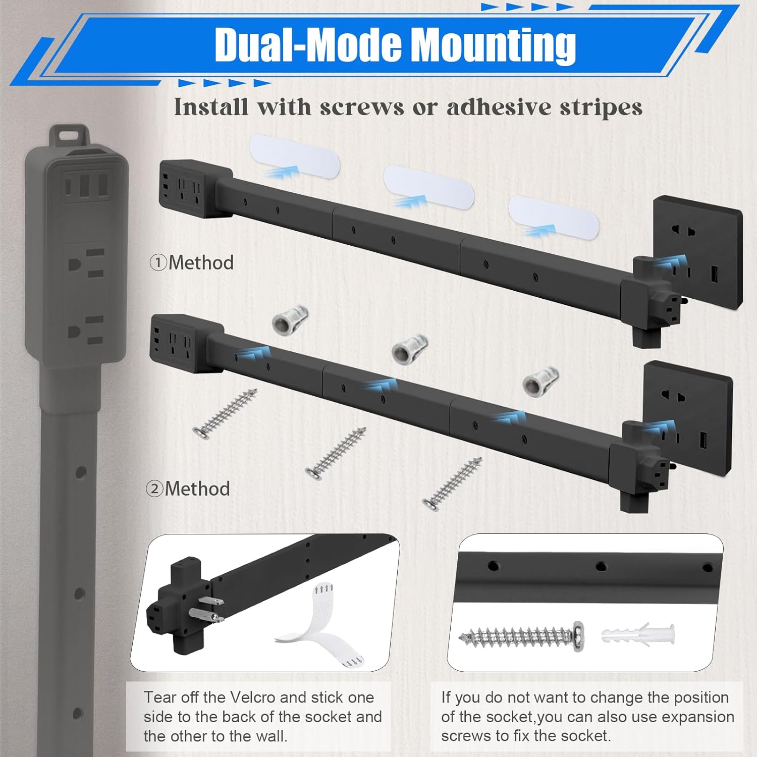 | BuiltIn Media | 3 extension rods, 1 multi-function socket, 1 four-way rotating plug, 20 mounting screws, 8 strong adhesive strips, 1 detailed instruction manual |